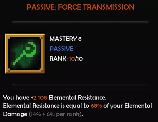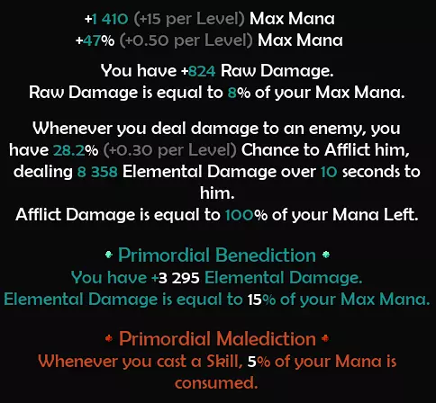 这绝对是个双赢的选择。既然我们会拥有大量魔力,要是必须保持低魔力状态(如果没有魔力回复或魔力吸取),那会很耗时间,所以这个效果能让我们每次施法消耗5%的魔力,相当不错。 原始版本还有个很棒的地方,它能提供元素伤害。但我们用的是毒素伤害,你可能会说这会提升技能伤害。没错,但你看这个: