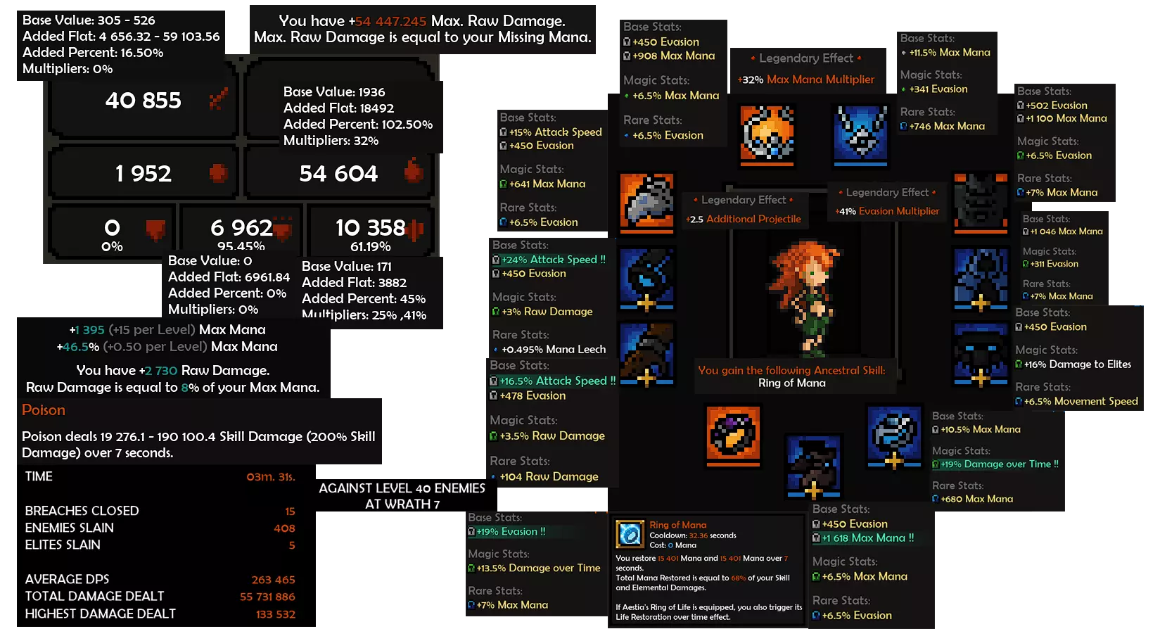 装备 基础属性池加成:按以下优先级顺序添加,若装备上不存在该属性或已存在,则跳过。 固定闪避值 固定最大法力值 闪避值百分比 最大法力值百分比 攻击速度百分比 你应主要寻找名为【轻型……】和【神秘……】的基础装备。 魔法属性池加成:在基础属性池加成的基础上,额外添加以下属性 原始伤害百分比 对精英怪伤害百分比 移动速度百分比 稀有属性池加成:与魔法属性池加成相同。 史诗属性池加成:由于每件装备的史诗属性加成池相同,以下是你获得史诗装备时值得保留的所有优质属性。稀有词缀池模组中的词缀 伤害持续时间百分比 所有暴击相关属性(但我不会强化这个,不过它可能本身就更强) 如果你使用箭雨技能,除了上述词缀外,以下词缀也会很有用: 范围效果增强百分比 范围大小增加百分比 死神、属性和专精词缀 选择你正在使用的即可。死神职业可能选科里·铁腕,专精技能可选箭雨或连射,属性可选野蛮、意志力或狂怒。 所需传奇特效 头盔 头盔基本上需要(但并非必需)最大法力值倍数百分比,可从【风暴钻石镶嵌王冠】获得。 护甲 【黑暗之心】。通过闪避倍数获得更多闪避。披风 当你在这套构筑中主要使用毒素伤害时,自然会想要【噬魂披风】。它能使持续伤害或引导类技能(毒素伤害同样适用)每次造成敌人最大生命值1%(若装备有+30词条则为7%)的额外伤害。 肩膀 如果你想使用箭矢射击技能,那么【以太克隆肩甲】提供的额外投射物是必要的。对于使用箭矢射击的玩法来说,这能带来更好的体验。 手套 如果你在受到伤害后没有死亡,也无法吸血(虽然很难想象这些情况会同时发生),可以考虑装备【不朽之握】。它能在接下来的几秒内,基于你最高7%的元素伤害为你恢复生命值。不过这个装备并非必需。 戒指 如果无法一次性对全屏敌人施加毒素效果,那么毒素扩散的几率在某些时候会很有用。它来自【Ezdock’s Pandemy】。不需要 其他戒指 【魔力戒指】很不错。有时候你可能没有足够的魔力来施放法术,所以拥有一种能瞬间恢复魔力的方法会很好。 靴子 加金币获取的靴子【米多斯的闪光之靴】很好,因为它能增加你的金币收集范围。 项链 有一个你不会想要的传说级项链是【阿拉之泪】。因为为了获得野性的加成,你会恢复过多的魔力。(至少对于高强化等级的装备来说是这样,在低装备水平时它可能还行) perks和被动技能 专注于【箭雨】