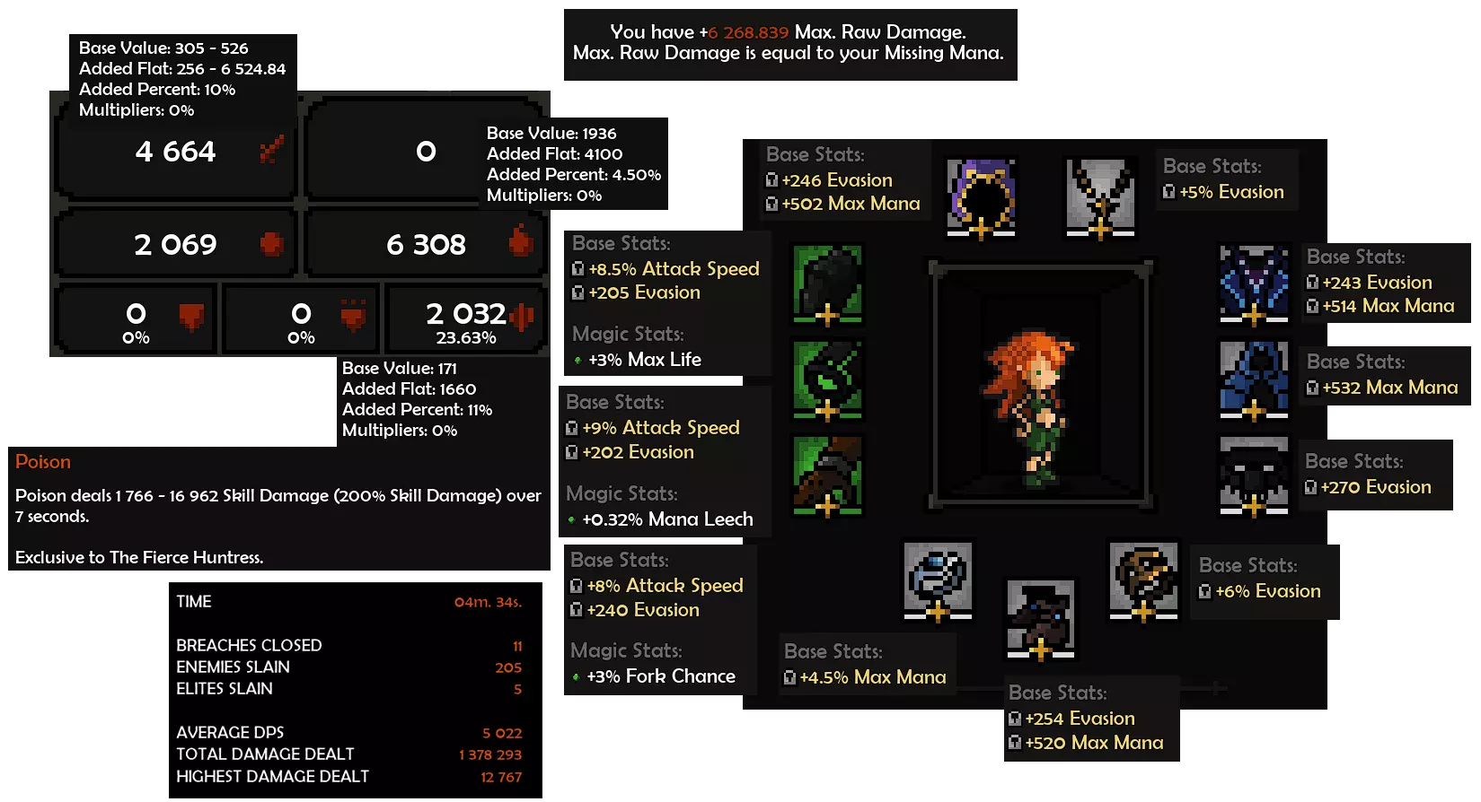 当你获得原始【凶猛亲和】时,就可以切换到这个(玩法/配置)。我们能从专精的被动技能中获得元素伤害以及元素伤害转元素抗性的效果(4-3技能提供元素伤害,6-2技能提供元素抗性转换)。当你拥有原始弓时,通常你应该已经有了一些不错的装备,并且法力值很可能超过20000。你会发现,为了达到最大原始伤害而消耗这么多法力值可能相当困难。 这个问题可以通过弓来解决,它的效果是每次施法消耗5%的法力值。为了更快地达成目标,我在开始探险时会狂按【箭矢射击】(因为其冷却时间更短),当法力值较低时,就完全切换到【箭雨】,像之前一样,通过保持【愉悦】状态来堆叠攻击速度层数。后期当你获得不错的攻击速度后,可以完全切换到【箭雨】技能,但施放【箭矢射击】总是更快。当你的装备足够好时,你可以只使用【箭矢射击】(我现在就是这么做的),你应该能在每个房间施放一次【箭矢射击】,最终所有敌人都会因中毒而死亡。很难存活下去
