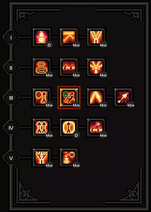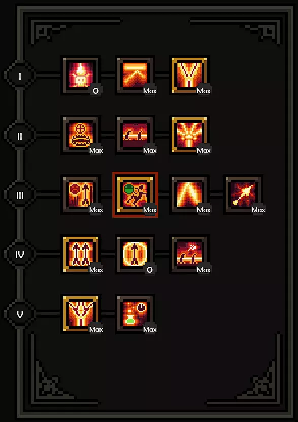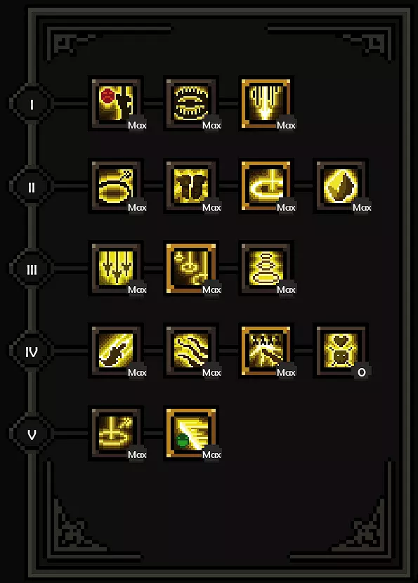 这里我们使用的是被动技能【尸骨成弩】(第4排第2个被动技能),因为我们目前还没有元素伤害(没有原始收割者)。所以我们也选择了第3排第3个被动技能,它能提供免费的生命值。虽然不多,但总是好的,因为目前我们还不会被一击秒杀。我们还选择了第6排第3个被动技能,因为没有元素伤害就意味着没有元素抗性。 对于【箭矢射击】,我们不使用这个技能,只在喜悦状态下使用第3排第2个被动技能来获得闪避倍率。所以基本上,我们只使用【箭雨】,从而一直保持喜悦状态。通过这种方式,在【箭雨】的第5排第2个被动技能的帮助下,我们可以获得高达50%的攻击速度,这在流派的早期阶段感觉非常好。如果我们使用其他技能,就会失去所有的叠加层数。我个人更喜欢选择2-3而不是2-1,因为拉怪(以及用3-2把怪物拉走)的感觉真的很棒。近战怪物根本打不到你! 目前你会发现 poison damage 不算太强,我们主要靠箭雨造成大部分伤害,但 poison 会终结怪物(因为我们通过专精的5-1获得了箭雨的 poison 效果)。 我个人把这套配置作为 build 的起点,因为 poison damage 感觉不太给力,用箭雨打伤害,再堆一些攻击速度和额外闪避,效果非常好。 箭矢射击+箭雨