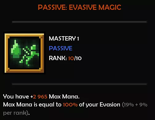 从闪避堆叠转向魔力堆叠 好的,这很棒,但你可能会问为什么之前还要堆叠闪避呢? 因为有【闪避魔法】这个被动技能。我们可以将100%的闪避值转化为魔力值,而魔力值会转化为伤害。而且闪避对于防御来说也很有用。