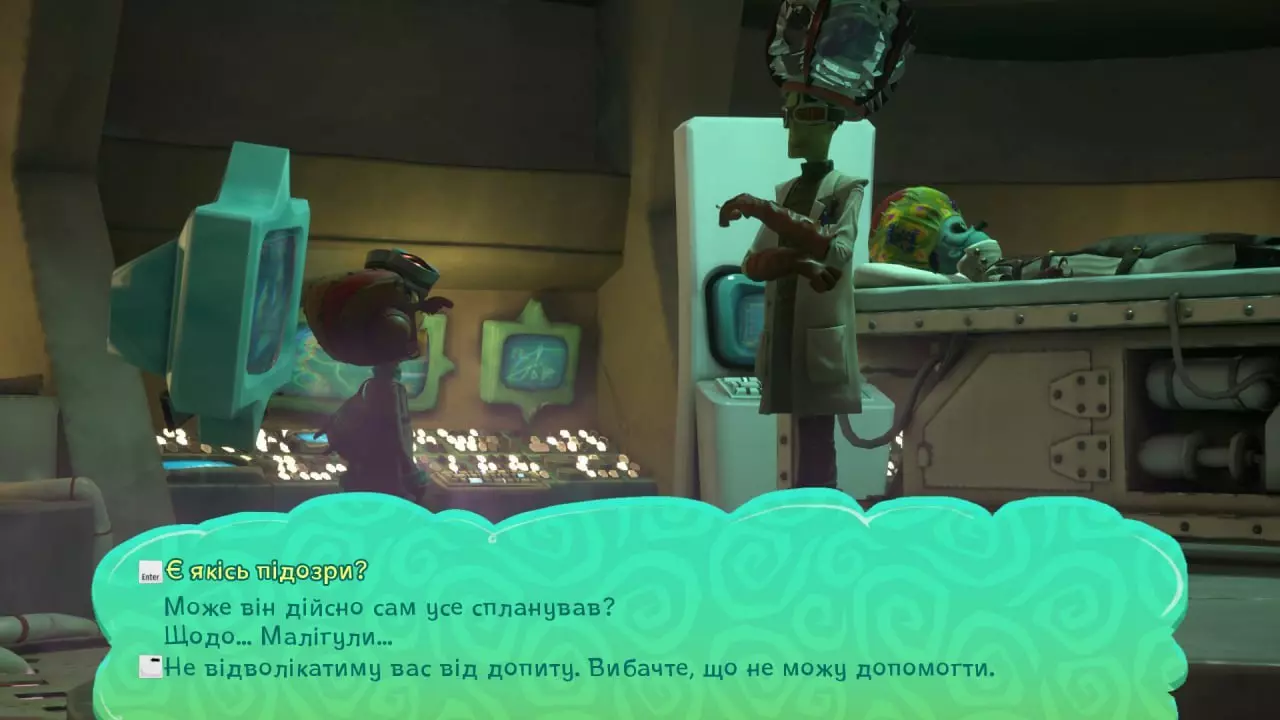 翻译版本v2.0.3:文本:100% 纹理:100% 翻译已完成,但在翻译过程中,我们可能在校对时遗漏了一些不完善之处和错误,不过这不会影响整体体验。 您可以在相应渠道反馈错误或提出修改建议。 游戏本地化安装 Windows系统安装步骤: 1.1. 下载文件PSY2UA_v2-0-3_P.pak。 2. 将其移动到路径《脑航员2》>Psychonauts2>Content>Paks(使其与Psychonauts2-WindowsNoEditor.pak位于同一文件夹中)。 完成。该乌克兰语化工具会替换英语并立即开始生效。 对于Mac: 1. 下载文件PSY2UA_v2-0-3_P.pak。 2. 在Steam中点击游戏属性>已安装文件>浏览。 3. 在Finder中右键点击Psychonauts2>显示包内容。 4.进入Contents > UE4 > Psychonauts2 > Content > Paks文件夹。将PSY2UA_v2-0-3_P.pak文件移至该文件夹。完成。该乌克兰语化工具会替换英语并立即开始运行。首次启动时可能会出现严重卡顿,之后会恢复正常。已在Mac M1 Pro 16 GB设备上测试。 安装乌克兰语成就: 1.下载UserGameStatsSchema_607080.bin文件。 2.将其放入Steam文件夹下的Steam > appcache > stats路径中。完成。重启Steam后,成就应该会被翻译。 演示 截图: