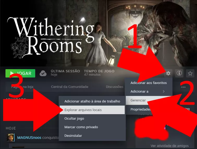 重要说明: 这是我在游戏发行时制作的翻译,当时是在那个替代模式下游玩……我刚刚将其更新到最新版本,现在才有机会,并且在别的地方发现了一个不错的折扣,用我自己的账号购买了游戏并发布。 如果遇到任何问题或语境错误,尤其是在谜题方面,请在这里告诉我,我会尽力帮忙。我的愿望清单 本指南发布前的最新捐赠者: CháDePikãoPreto 安装 下载翻译后: 1.打开游戏文件夹。 2.进入Steam库并选择游戏。 3.点击“设置”。 4.点击“管理”。 5.点击“浏览本地文件”。 此时会打开游戏文件夹。