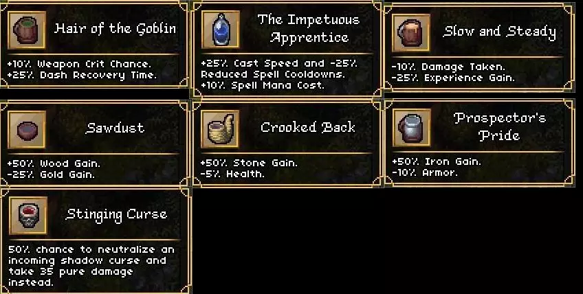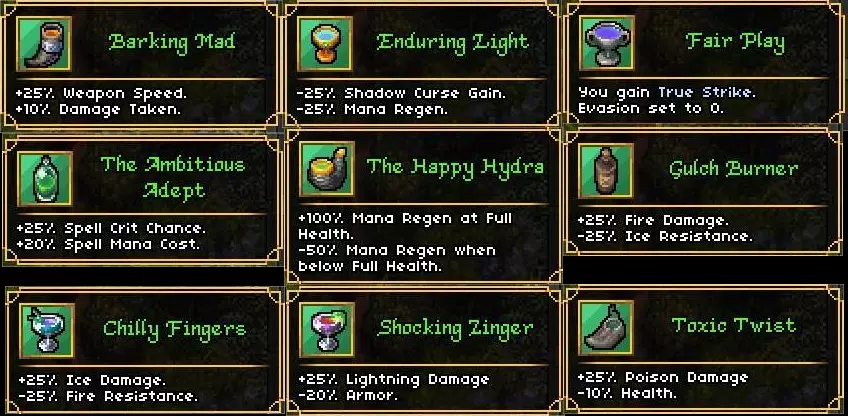 这是某游戏的开局可选食谱列表,开局可选1种食物和3种饮品,食物有 hearty meal、Elemental Breakfast等,分别提供生命法力回复、元素抗性等增益;饮品有Hair of the Goblin、The Impetuous Apprentice等,提供暴击率、施法速度等不同效果,还有部分负面属性,玩家可按需选择。