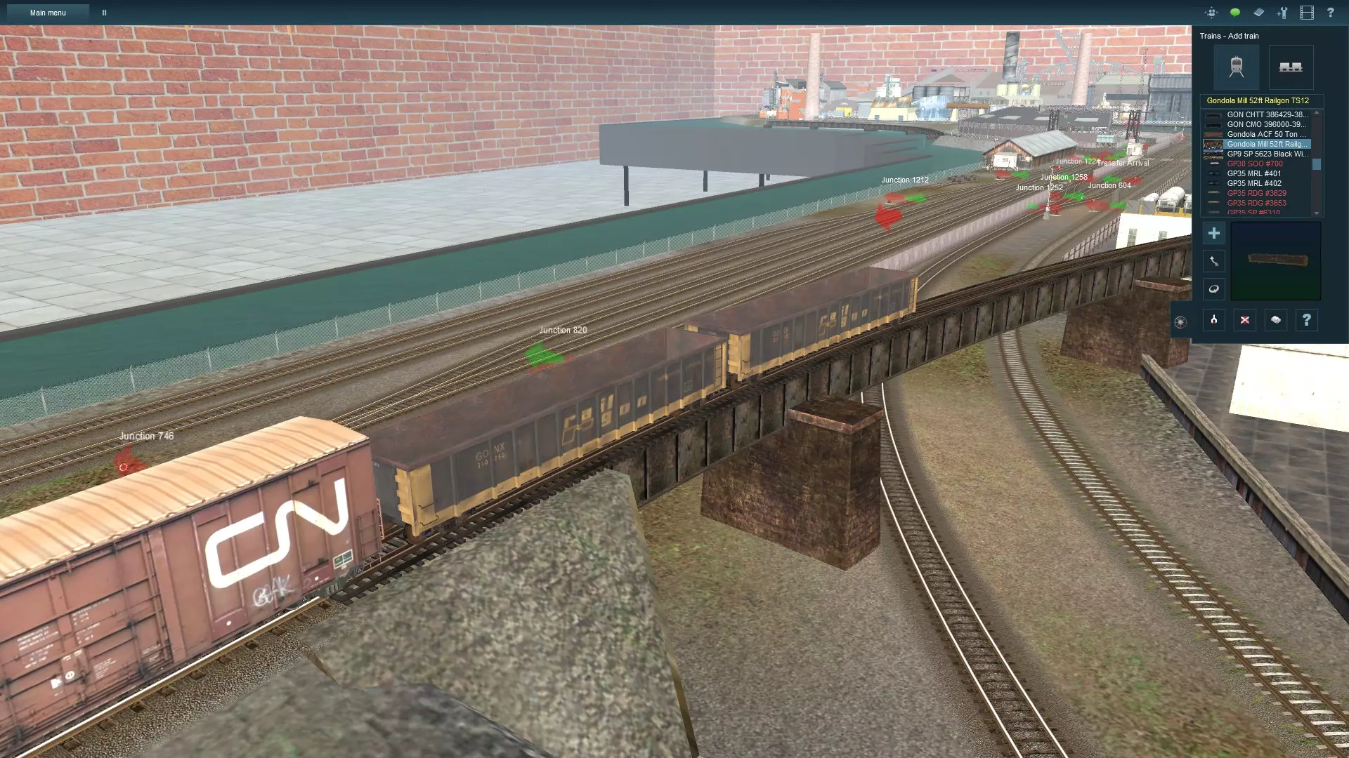 我在这里添加了两节 gondola 敞车。这类车厢的优点是顶部开放式设计,因此可以通过车辆详情菜单添加可见的货物。