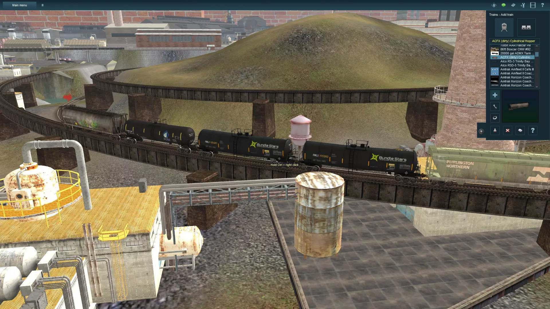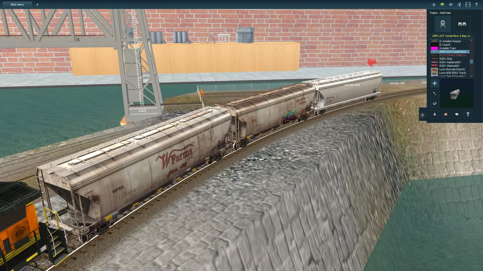 两台机车足以牵引我们这列中等长度的列车。注意第二台机车上有那个红色的备用零件。像这样的小细节能让列车看起来更逼真,因为这在现实中的列车上很常见。选择机车时,尽量挑选同类型的机车。例如,如果我想的话,可以使用一台ATSF B40-8w型机车;它们都运行在同一地区的铁路线上。然而,一台CSX GP40型机车出现在这个机列组合中就会显得格格不入。 当使用多台机车时,可以尝试改变一台或多台机车的方向,但第一台机车始终要朝前。当使用三台或更多机车时,尽量不要让连续三台机车朝向同一个方向。至少要让其中一台调转方向。现实中大多数列车至少有一台机车朝向相反方向,因此加入这一设定能极大增强真实感。 添加车辆 编组中最重要的部分是车厢。为了开始我们的编组,我决定使用一些ACF侧卸式漏斗车。