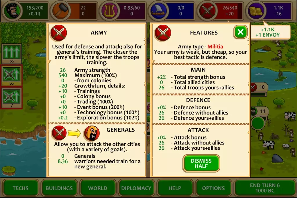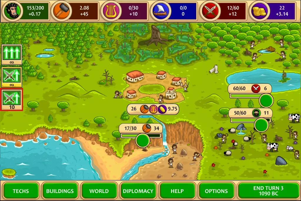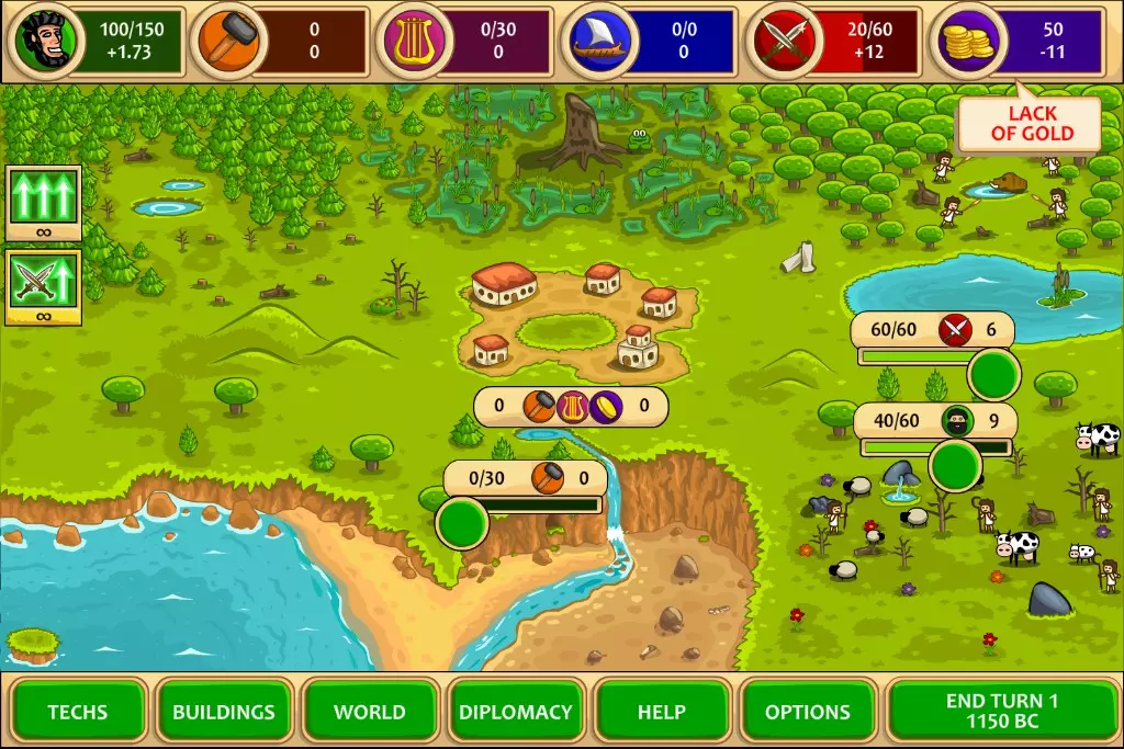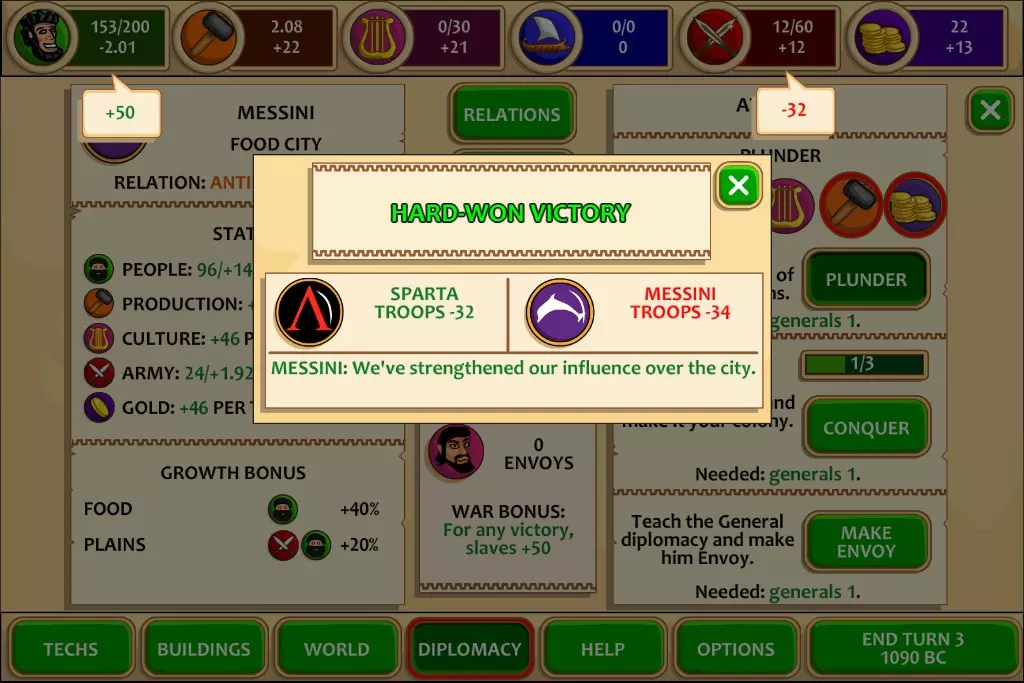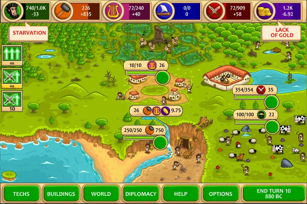 卖掉一半的部队,每个士兵可获得40黄金,这样能得到约1.1k黄金,足够支撑很多回合了。由于现在有100%的军队增长加成,所以造兵后再卖掉来赚钱是很划算的,对于斯巴达来说,交易根本不值一提。第10回合