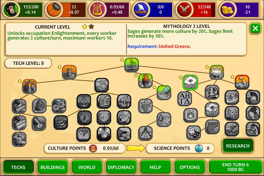 科技点数将会损失。因此,不要太晚统一希腊,否则你会浪费大量文化值。