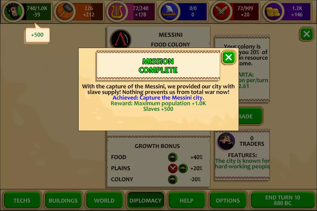 同一回合,攻陷迈锡尼,完成任务,获得500人口,加上迈锡尼的50人口,总计550人口!