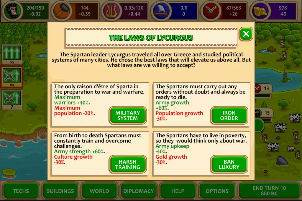 艰难的抉择来了,乍一眼看上去四个律法都很诱人,但是代价也很大。不过稍作思考就会发现,如果你选了增强军队力量,那一定要选增加建造速度才能让之前的选项发挥最大效果;要是选择了增加建造速度,就必须搭配增加军队上限;而增加了军队上限,又得选择降低军费开支。 所以结论就是,当你把四个律法全部选上之后,它们会相辅相成,产生从量变到质变的效果,真正的战斗民族斯巴达就此成型! 而且,由于有60%的造兵速度加成,接下来依然可以通过造兵卖兵来赚钱,完全不需要加商业科技,多余的科技点可以点到军事科技树上面,让斯巴达变得更强。同时减少40%军费开支这个律法效果其实好得出奇,因为初始的军费开支只有50%,而这个减少竟然不是相乘的关系而是相减!那就意味着最终只有10%的军费开支,妈妈再也不用担心我屯兵了! 这个选择面板是【斯巴达】的核心。律法的增强效果非常吸引人,但其缺点也同样令人失望。 用【斯巴达】进行游戏的正确方式是选择上述所有律法。当四项律法的军队增强效果结合在一起时,将唤醒一个战斗民族! PS:由于军队增长+60%,招募并解散军队比贸易方式更有利可图。因此我们可以将贸易科技树的科技点节省下来投入到军事科技树中,这会让【斯巴达】变得更加强大。补充说明:“禁止奢侈品”法案非常有趣。其效果比我预期的要好得多。初始军队维护费为50%。在“军队维护费-40%”的效果作用后,它并没有变成50%×(1-40%)=30%,而是变成了50%-40%=10%。天啊!10%的军队维护费意味着什么,这意味着我们可以毫无顾虑地拥有庞大的军队,而不用担心金币问题!