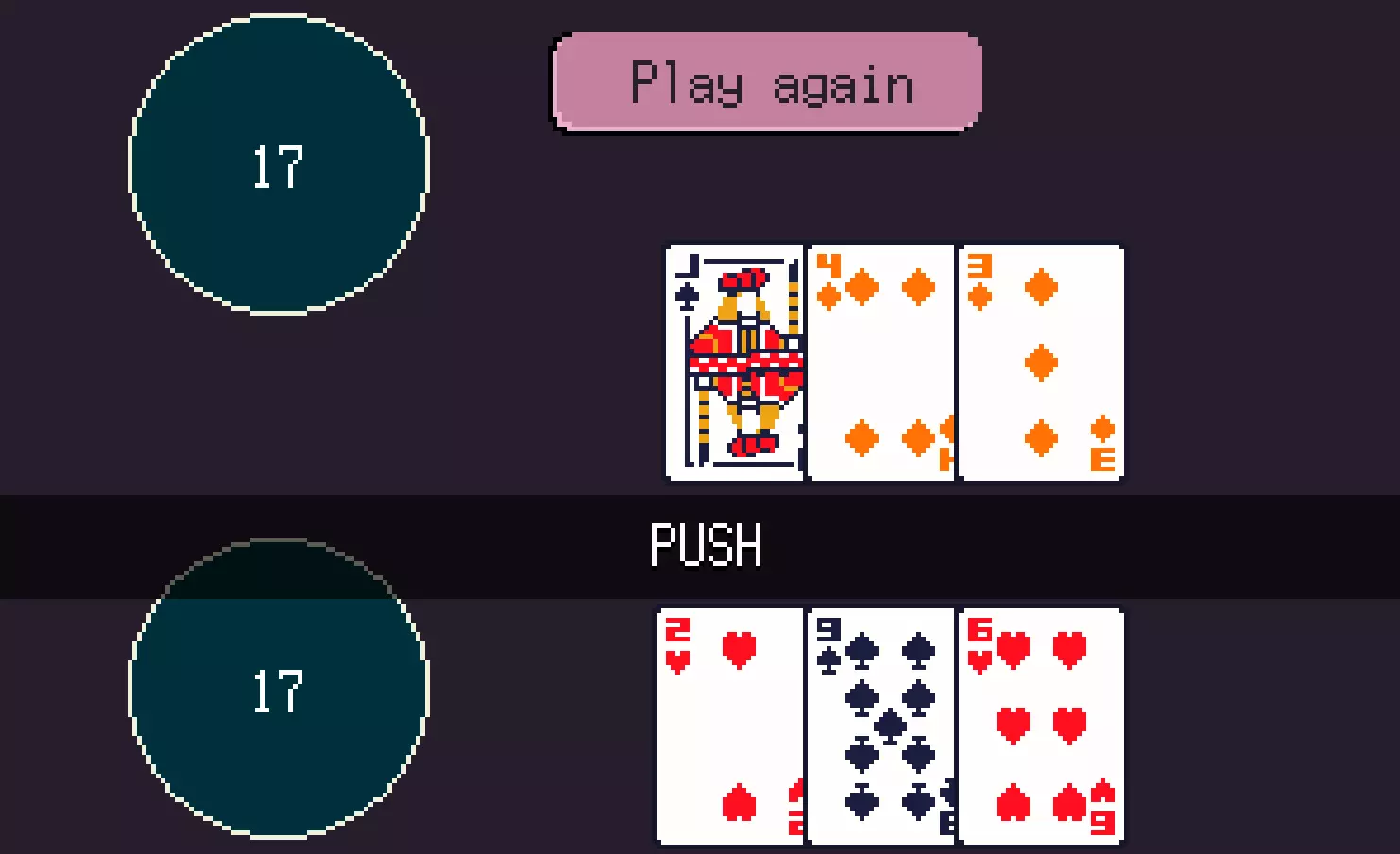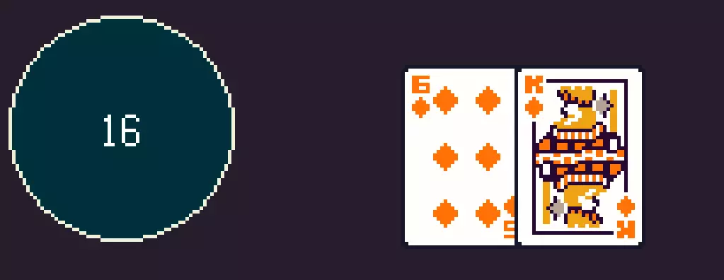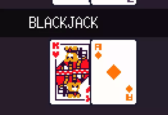卡牌点数:A可以算作11点或1点,游戏会自动选择。如果11点能让你更接近21点,就会选择11点;如果11点会让你的手牌爆掉,就会自动算作1点。K、Q、J都算10点。其他所有卡牌均按牌面数字计算点数。(有趣的是,根据我的经验,如果AI抽到任何可能的10点牌或A,它们很有可能拿到21点或20点,所以要小心。) J和6组成的手牌点数为16点