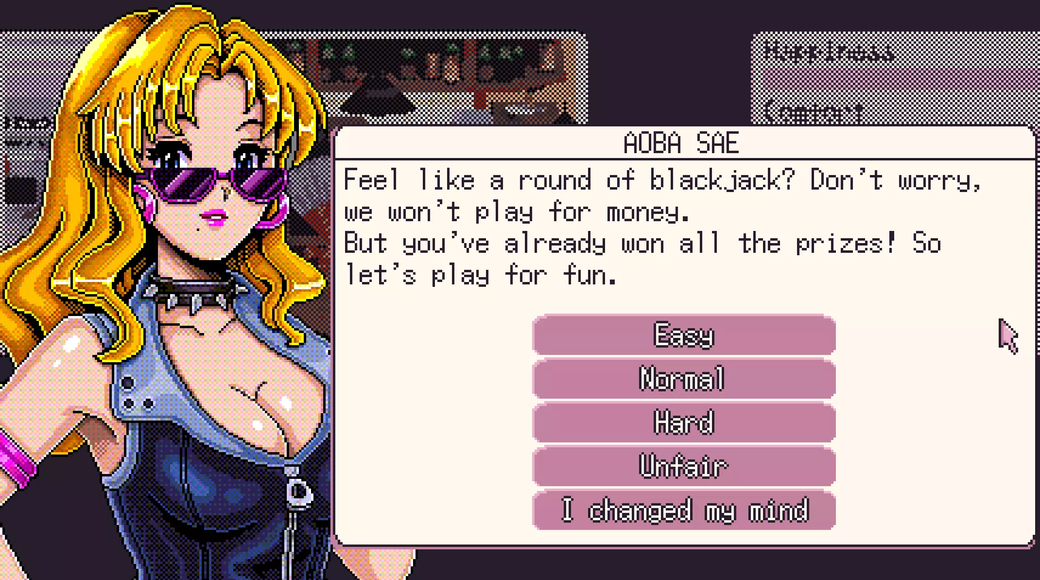 按钮含义: 投降 - 绝对不要选这个,完全没有意义。无论如何你都相当于放弃了,不管是否要牌、是否推注、是否停牌,你都会输掉赌注。 停牌 - 你对自己的手牌感到满意,不想再要牌或投降。(除非拿到 blackjack,否则通常每次都点击这个按钮) 要牌 - 荷官会再给你发一张牌。 提示:如牌面价值部分所述;(有趣的是,如果AI抽到任何可能的10点牌或A,它们有很大概率组成21点或20点,至少根据我的经验,此时要小心)。通常来说,如果你的手牌点数低于16,最好选择要牌;但如果点数达到或超过16,最好选择停牌。尤其是当你手牌为16时,只要再抽到一张大于5的牌就会爆牌。不过,还有一个额外的规则:如果你想碰碰运气,或者觉得AI的手牌肯定更好且不太可能爆牌,那么在手牌正好是16点(甚至在极少数情况下是17点)时选择要牌也不是一个糟糕的主意。 恭喜你赢了! 你获得了:恭喜!你在二十一点中击败了沙绘,成功赢得了简单难度的奖励。这个奖励是一杯小饮料,你可以将它送给某人,大幅提升你们的友谊值。 所有高于简单难度的模式(普通、困难、不公平)你会看到一个奖励界面,里面有3个物品可供选择。请注意,你无法通过重玩来获得更多奖励,只能选择一次。之后如果你再尝试,她只会说:“这次就为了好玩而玩吧。” 我会选择特权而非一次性使用物品,因为特权能提供永久性的长期加成,而其他所有物品都只在单次使用时有效,用完就没了。不过奖励池似乎有点大,所以你通常只能得到效果很差的特权或非常一般的选项。