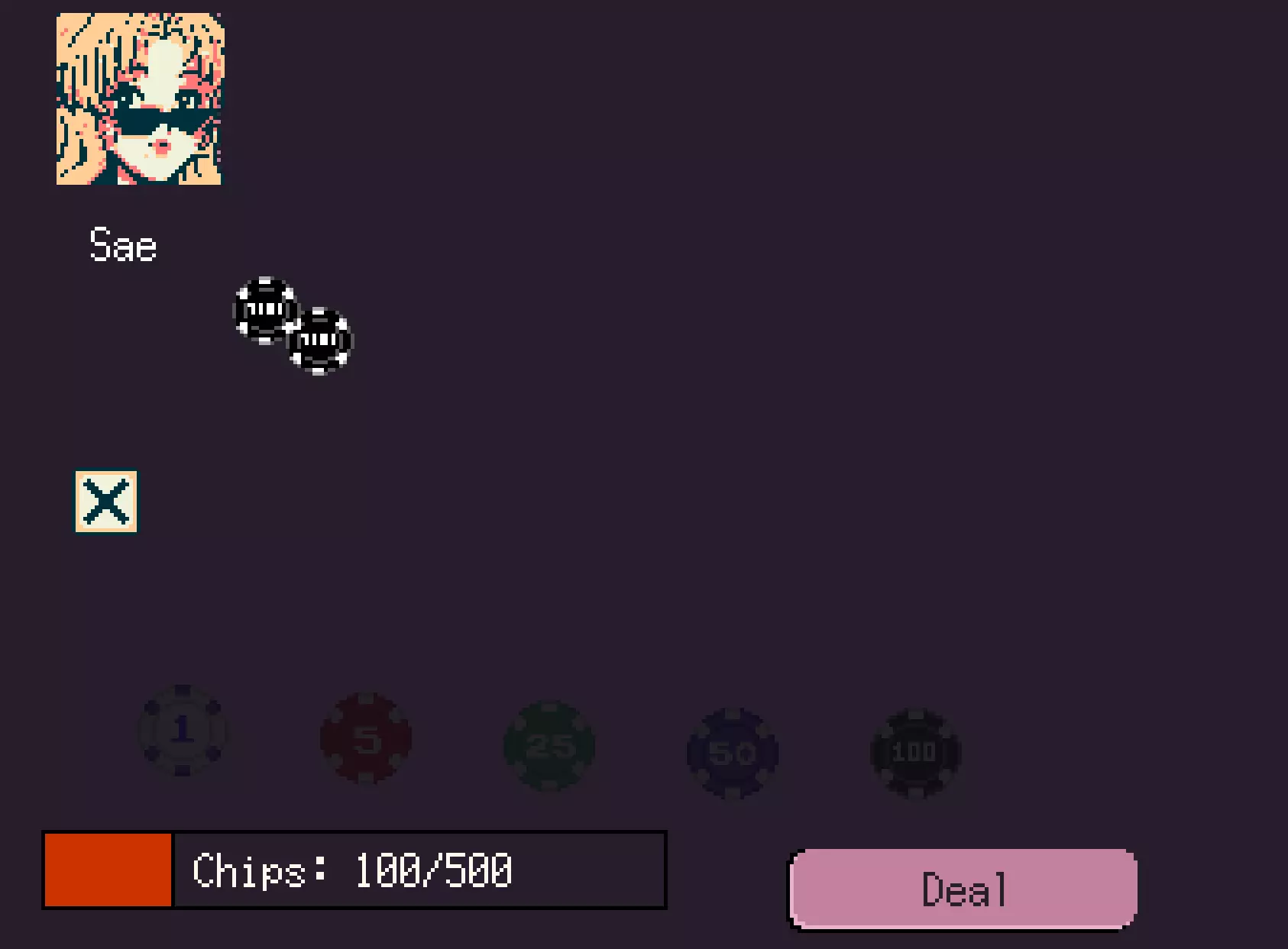 第四步 步骤4:下注,你有几个选择。请注意你拥有的筹码总数,在简单难度下我们有300/500的筹码,这意味着我们可以轻松下注100筹码且没问题。 关于筹码下注选项,你总共可以下注200筹码价值的任意组合,或者如果你想稳妥一些,也可以下注少于200的任意数额。 例如,4个50筹码加起来就是200,这是最大下注额。请注意,如果你赢了,你下注的筹码会返还,所以如果我下注200,我会得到200的奖金加上我下注的200,总共400。300/500加上200等于500/500,意味着简单难度只需一局就能获胜。 筹码下注金额: 1 5 25 50 100 最大下注总额为200(任意组合)