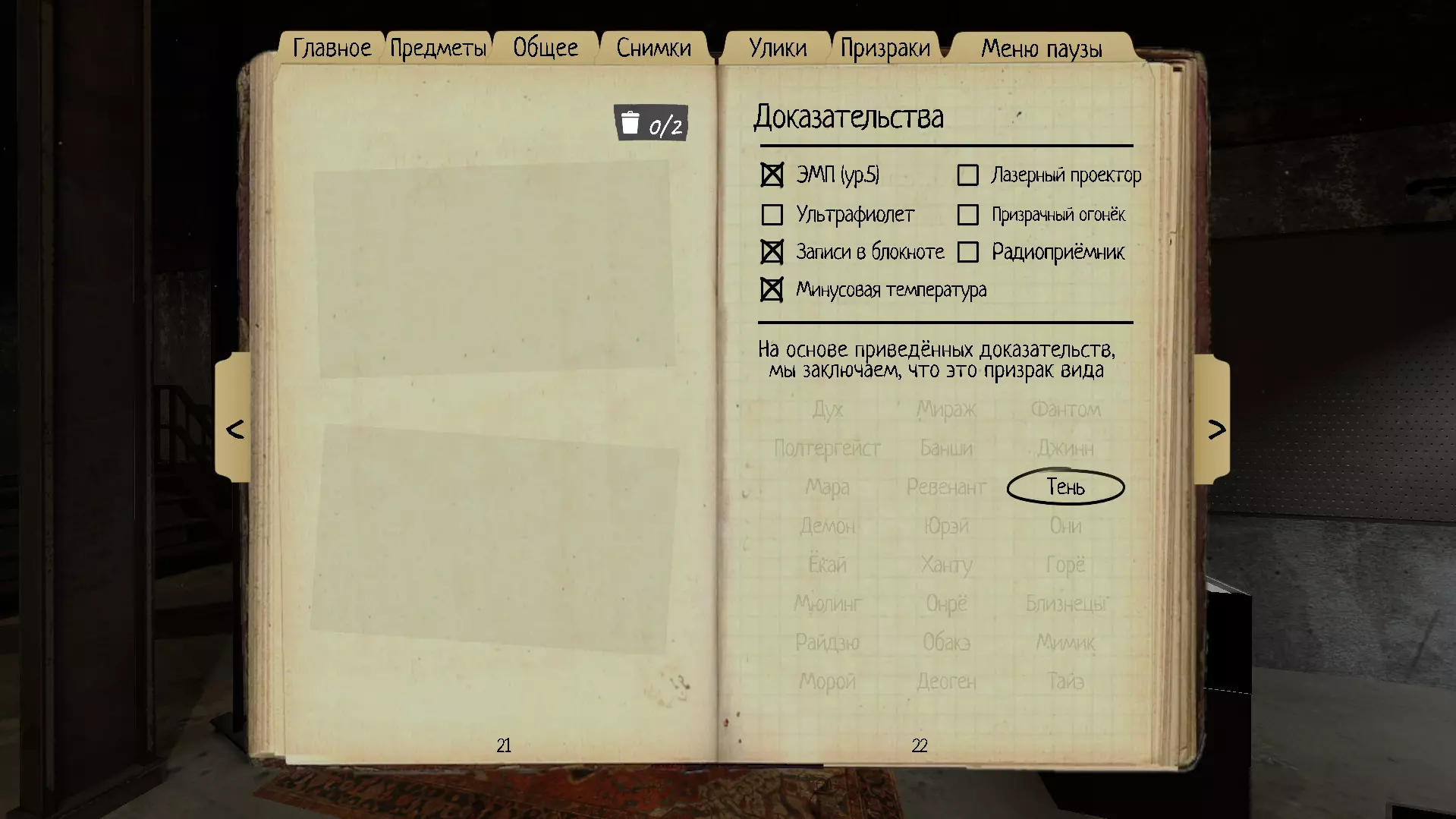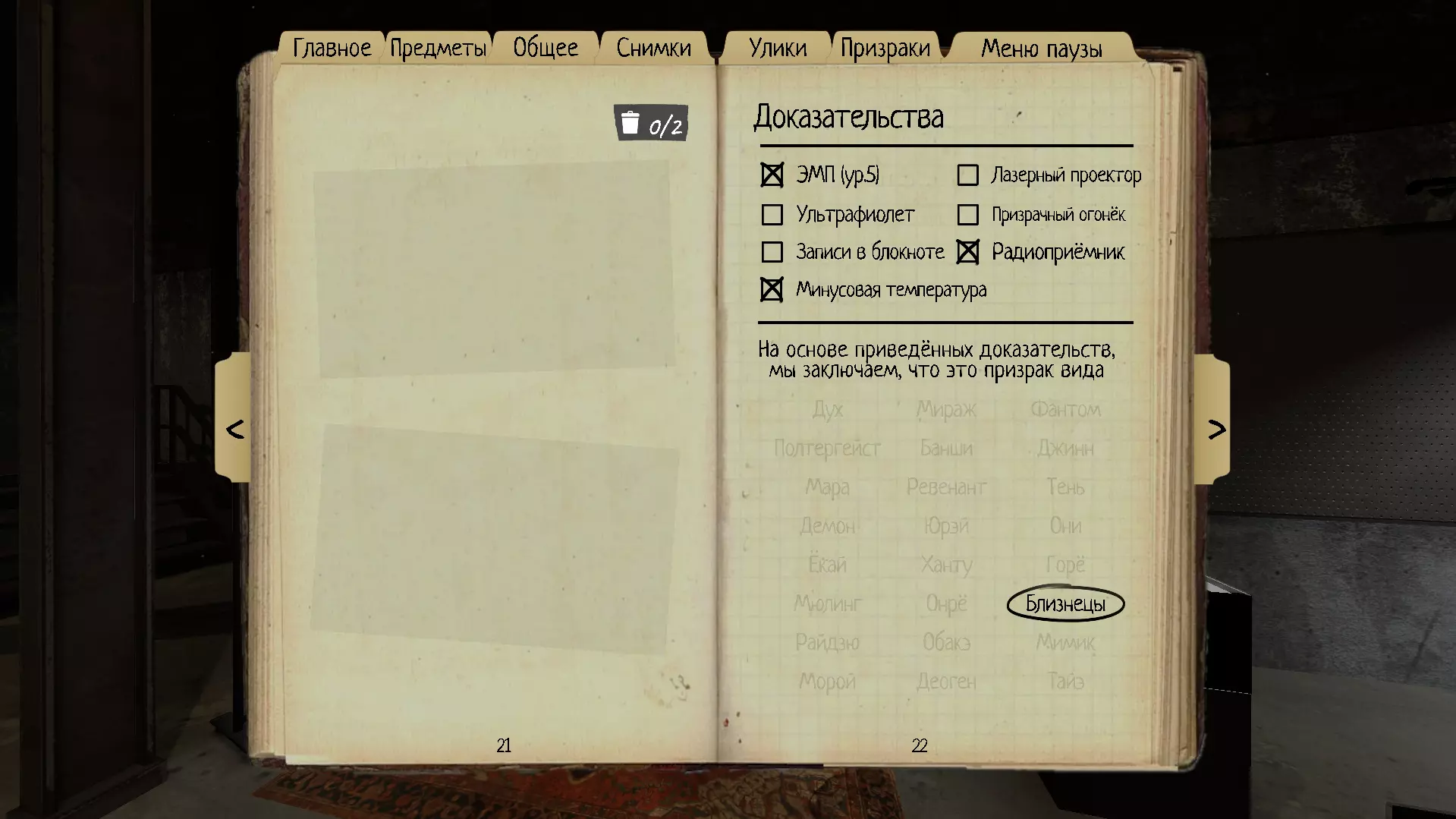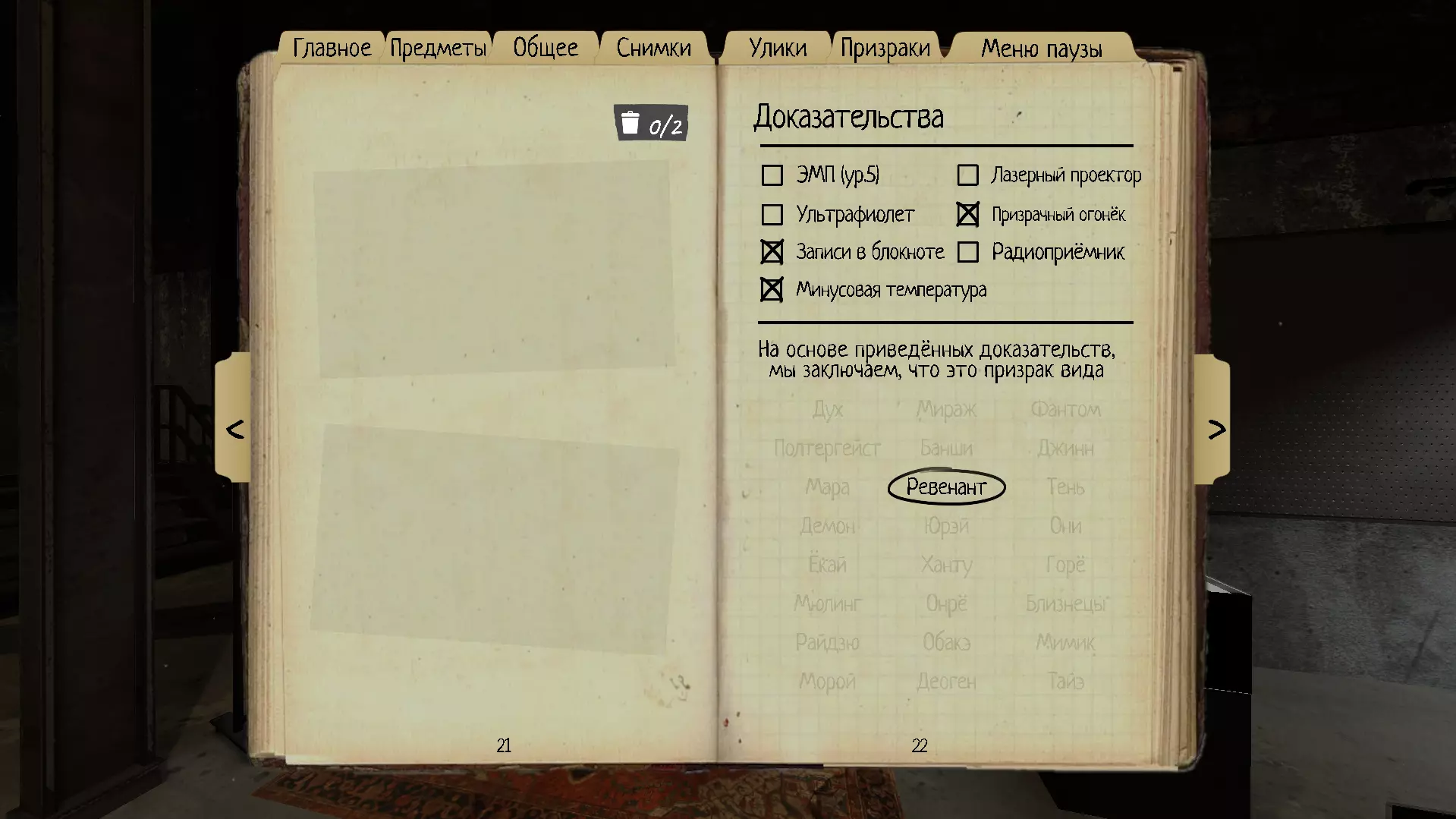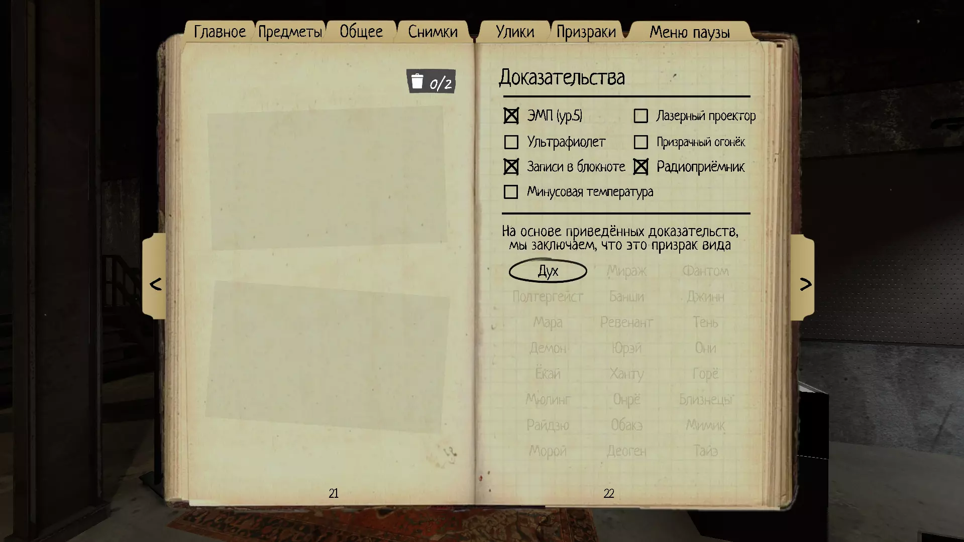 1. 幽灵(Spirit) 它与其他类型的鬼魂不同,没有任何明显的强项。熏香产生的烟雾能在一段时间内使幽灵失去能力。 理智阈值:50% 速度:1.7米/秒 证据:EMF5级、笔记、收音机 特性:在幽灵附近使用熏香后,它将在180秒内无法开始狩猎(而非通常的90秒)。在使用香薰的瞬间计时(而非狩猎结束后)。 该幽灵有时会比其他幽灵更活跃,因为它在互动之间会有短暂的停顿。 如何在没有线索的情况下在启示录III中识别:在幽灵附近使用香薰,计时并等待180秒,如果在此期间没有开始狩猎,那么它就是幽灵(最好重复几次)。