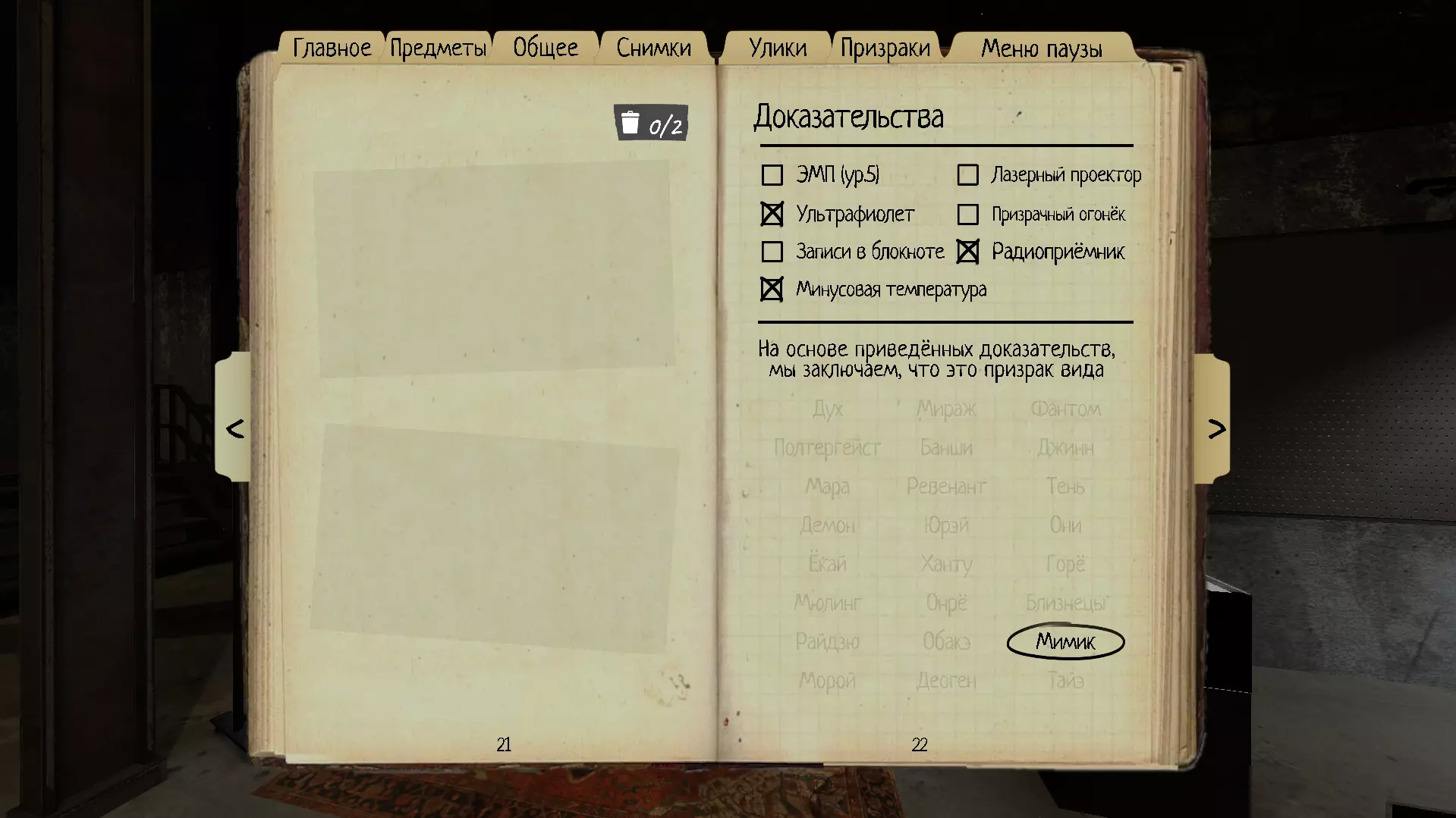 21. 拟态灵(Mimic) 我们尚不清楚这个鬼魂还能做什么。请务必小心。有多次记录显示,拟态灵附近会出现鬼火。 理智阈值:100% 速度:1.7米/秒 证据:收音机、紫外线、零下温度 特性:可以模仿任何其他类型的鬼魂,包括它们的特征、特点、狩猎时的速度以及开始狩猎的理智阈值。它总是会将幽灵之火作为第4个证据(噩梦难度为3个,疯狂难度为2个,无证据模式为1个)。 它每30-120秒会改变一次自己的幽灵类型。 如何在启示录III难度下不依靠线索进行识别:最简单有效的方法是在幽灵常出现的房间用摄像机检查是否有幽灵之火,如果有,那么你面对的100%是拟态。如果鬼魂每隔30-120秒改变一次行为、移动速度等特征,以此模仿不同的鬼魂,那么它就是【拟态】。