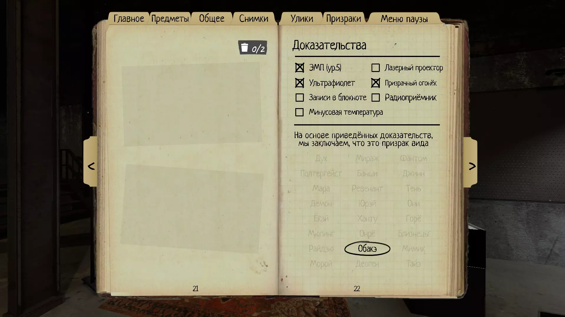 20. 怨灵(Obake) 这个鬼魂有时会改变外形,并在此过程中留下独特的痕迹。 理智阈值:50% 速度:1.7米/秒 证据:EMF5级,紫外线,幽灵 Orb 特性:在狩猎时闪烁期间,怨灵有6.66%的概率将模型更换为同性别其他模型,每次狩猎至少会变换一次外形。 当至少有一个证据时,留下指纹的概率为75%(通常为100%)。在至少拥有一个证据的游戏中,有几率留下独特的六指手印(而非五指),开关上会留下两个手印(而非一个),键盘和相机格栅上会留下五个手印(而非四个)。在至少拥有一个证据的游戏中,始终会有【紫外线】证据。如何在无证据模式下识别【世界末日3】难度的幽灵:如果你在无证据模式下游戏,【御灵】(Obake)永远不会留下紫外线证据,因此只能通过其在狩猎时改变形态的能力来识别。强大的循环技巧对于长时间将其保持在视野内,并在闪烁时捕捉幽灵模型的变化非常有用。使用T3级香或盐可以在这方面显著降低难度。外貌变化的概率为6.66%,但在一次狩猎中,御灵【Obake】至少会有一次外貌变化。