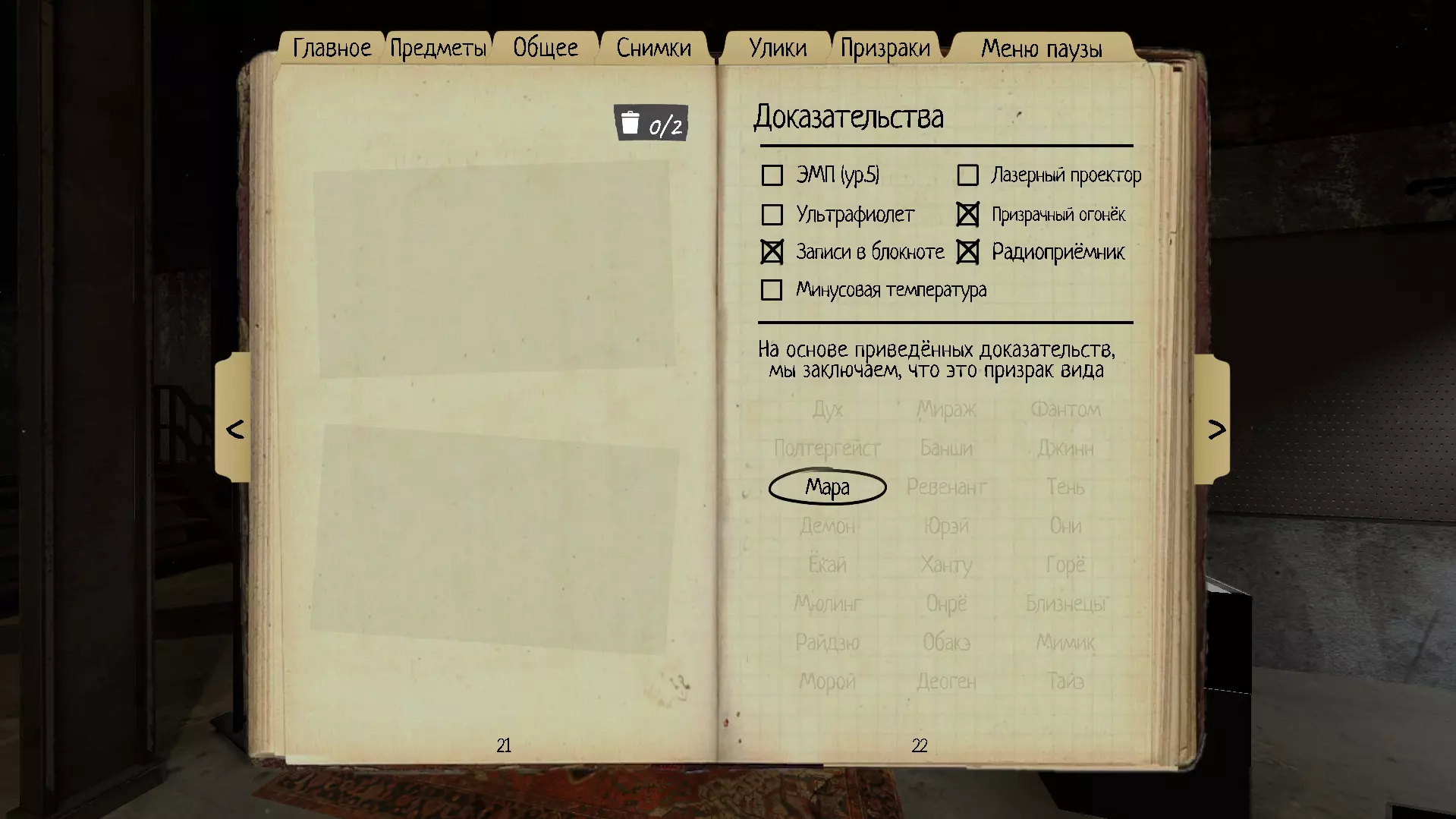 7. 梦魇(Mare) 梦魇在黑暗中会变得更加具有攻击性。在有光照的房间里,被梦魇攻击的概率较低。 理智阈值:60% 速度:1.7米/秒 证据:收音机、幽灵之光、笔记 特性:梦魇永远不会开灯。 当幽灵所在房间的灯关闭时,理智阈值为60%;灯开启时,理智阈值为40%。 有时会立即关闭玩家刚刚打开的灯。出现“灯泡爆炸”超自然现象的概率很高。玛丽爆炸灯泡的概率不受灯光开启或关闭的影响。如果玩家在距离玛丽4米范围内开灯,玛丽有较小概率会几乎立即将灯关闭。玛丽的该能力冷却时间为10秒,无论开启还是关闭灯光时,若玛丽未能成功使用技能,都会触发冷却。也就是说,当你打开灯光后,玛丽可能会突然将其关闭,但如果她没有这么做,冷却计时器会在玩家与灯光开关互动后立即启动。因此,频繁开关灯光是没有意义的。【幻影】即使在发电机关闭或损坏的情况下也能使用该能力,但灯泡爆裂时不行。此外,如果在发电机关闭或损坏时快速开关灯光,【幻影】使用能力时可能会将其打开,这很可能是一个漏洞。如果鬼魂打开了灯光,那肯定不是【幻影】。
