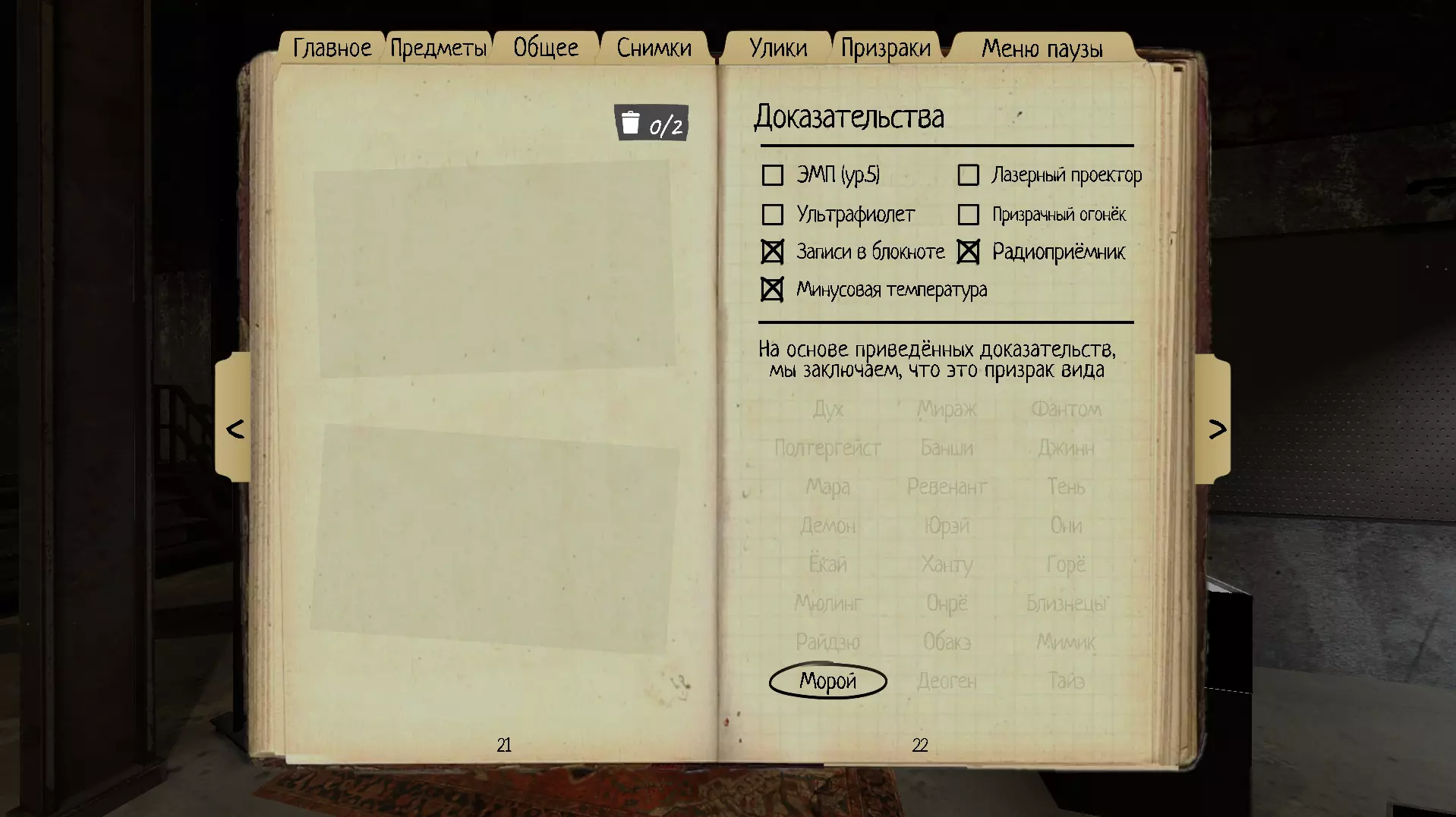 22. 莫罗伊(Moroi) 受害者越虚弱,莫罗伊就越强。 理智阈值:50% 速度:1.5米/秒 - 2.25米/秒 证据:收音机,笔记本记录,低温 特殊能力:通过定向麦克风或收音机回应来诅咒玩家,并使理智被动下降速度翻倍。离开房屋可暂停诅咒,服用镇定剂可完全解除诅咒。香薰造成的致盲持续时间增加50%(从5秒延长至7.5秒) 团队平均理智值越低,鬼魂移动速度越快 当游戏至少需要一个证据时,【收音机】始终会作为线索出现 通过听觉根据移动速度来判断(在启示录III难度下无需线索时)在【启示录III】难度中,理智值基础水平将为0%,因此从游戏开始,鬼魂就会以其最高速度2.25米/秒移动。