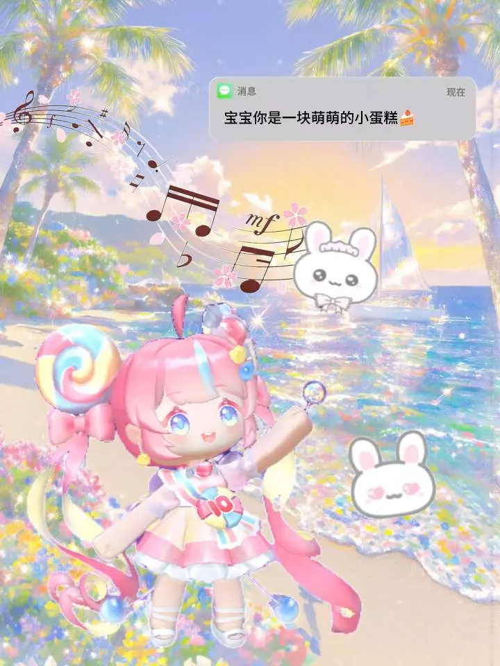 这是迷你世界的创作图文,展示了可爱的粉色系迷你角色分别置身春日花海与夏日海边的场景,搭配温馨文案与互动消息,尽显角色的软萌可爱,传递出浪漫治愈的氛围。