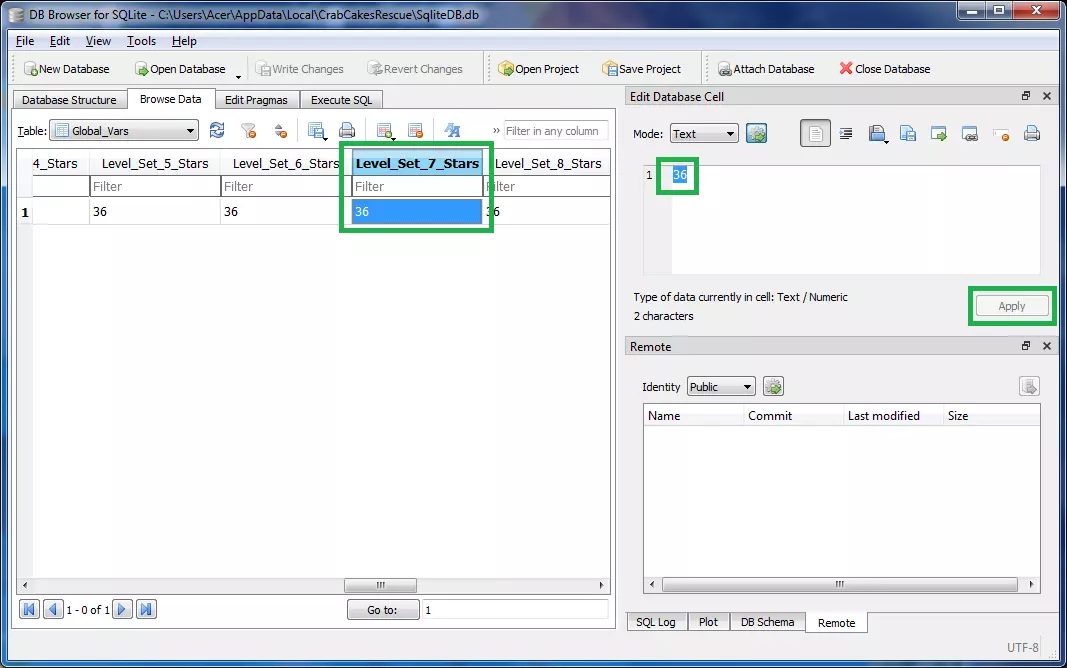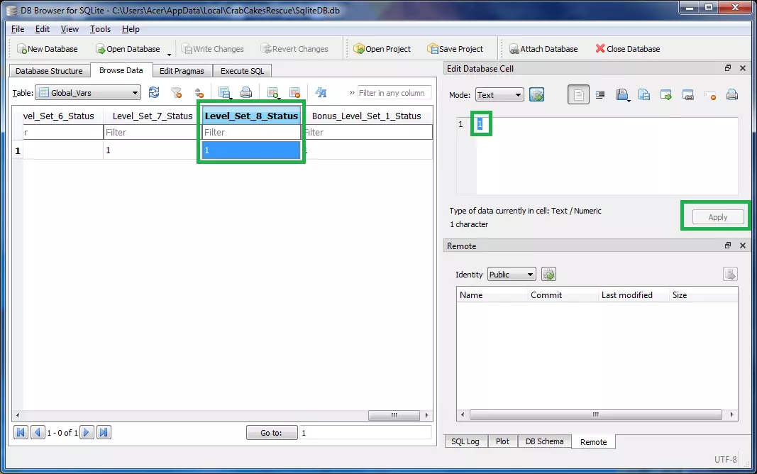 7. 更改关卡集8的状态为1。在“浏览数据”的最末尾,你可以找到名为“Level_Set_8_Status”的值。你需要将其从0更改为1,然后点击应用。