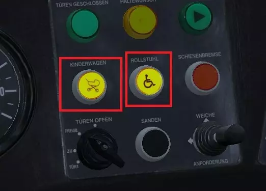 这是一个主车门开关。它有四个档位: Tur 1 - 打开/关闭1号车门 ZU - 在允许的情况下关闭所有车门 Freigabe - 允许通过乘客车厢内的按钮和外部按钮打开车门 Turen Offen - 打开所有车门 到达车站后,选择【Freigabe】以允许乘客打开车门。发车前选择【ZU】并等待车门关闭。 外部【车门开启】按钮: