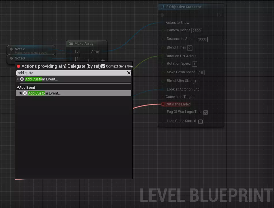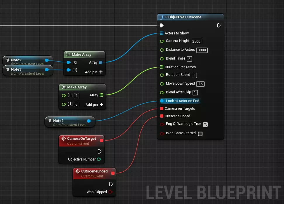 战争迷雾逻辑启用:在目标过场动画期间,战争迷雾的视觉效果会关闭,但战争迷雾逻辑仍然适用:这意味着例如距离你的部队过远的单位将不可见。取消勾选此布尔值可更改此行为,以便在过场动画期间显示所有内容。 游戏开始时启用:如果要在关卡一开始就启动目标场景,请将此标记为启用。记住,不要使用“开始游戏”,而应使用“游戏开始事件”! 以上就是全部内容!如果你感到无从下手,只需先填充“要显示的演员”和“每个演员的持续时间”数组,并创建事件(这是关卡蓝图编译所必需的,即使你不使用这些事件),只有在完成这些设置后,再尝试调整其余参数。祝你好运!