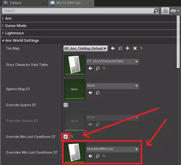 行名称:地图结束说明的ID,玩家不可见。 说明:嗯……就是关于地图成功/失败的说明。 接下来你需要将关卡设置为使用数据表中的说明,而非基础说明。进入世界设置,勾选“覆盖胜利失败条件数据表”选项,并将“已覆盖的胜利失败条件数据表”属性设置为你的数据表。