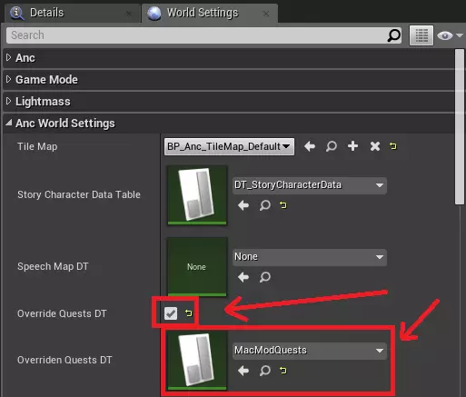 好的,现在我们需要配置关卡以实际使用此数据表。打开世界设置窗口,在【Anc世界设置】选项卡中勾选【覆盖任务数据表】复选框,然后将新创建的数据表关联到【覆盖任务数据表】属性。