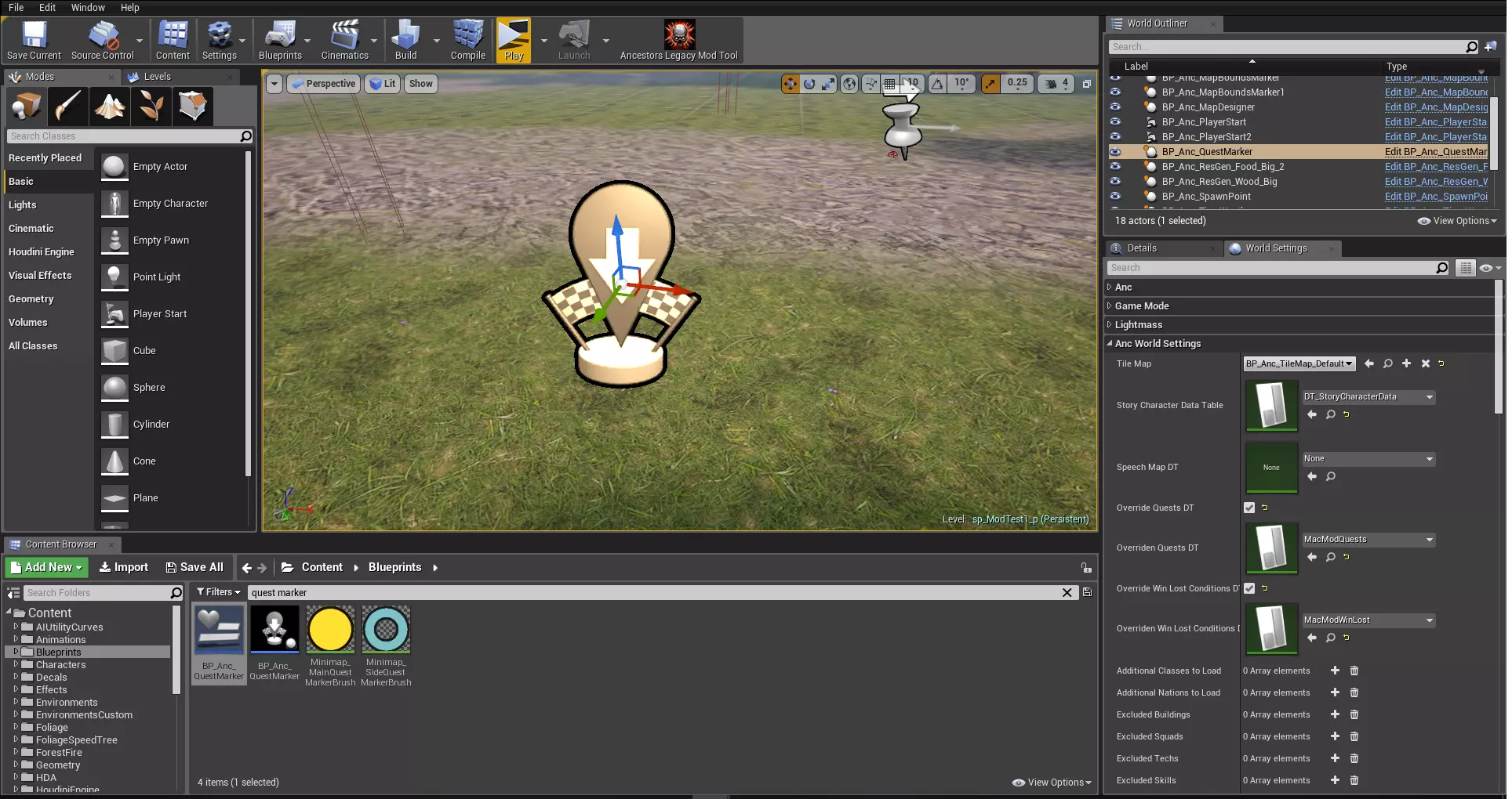 行名称:任务的唯一标识,玩家不可见。 是否为支线任务:若该任务非必须完成,则会以不同字体颜色显示。 任务名称:任务激活时会向玩家显示几秒钟的大型任务标题。 任务文本:任务激活期间始终对玩家可见的任务摘要。 任务成功完成时自动保存:任务完成时游戏是否执行自动保存? 任务失败时自动保存:任务失败时游戏是否执行自动保存? 任务更新时自动保存:任务更新时游戏是否执行自动保存? 标记文本:关卡中任务标记上方可见的文本。 在进入关卡蓝图之前,我们还需要一个东西:任务标记。在内容浏览器中找到它(蓝图'/Game/Blueprints/Game/BP_Anc_QuestMarker.BP_Anc_QuestMarker')并将其放置在关卡上。