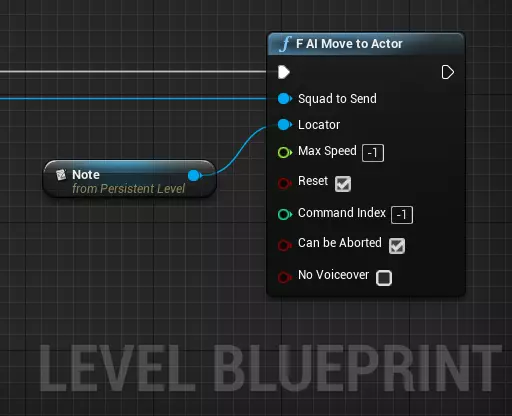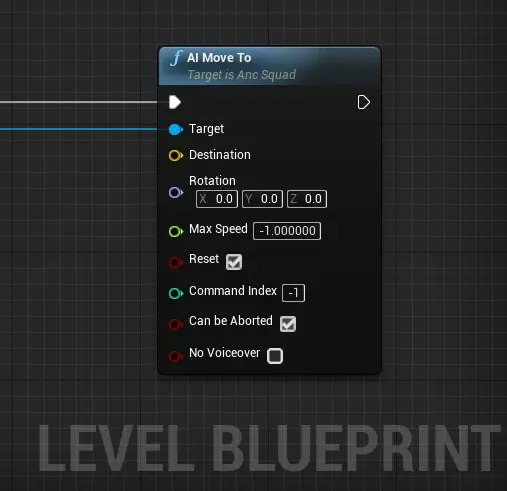 已获胜:通过此布尔值,你可以确定该节点会导致关卡失败还是关卡成功结束画面。 行名称:说明的ID,即说明数据表中的行名称。 就是这样! 基础AI脚本 如果你想为游戏角色编写一些行为脚本,这里可以找到一些关于实现工具和方法的基本信息。 通常,你需要引用AncSquad对象才能对其进行操作——获取该对象最简单的方法是通过BP_Anc_SpawnPoint的SquadSpawned事件——有关生成点的更多详细信息,请参考此处。当然,默认情况下,单人任务的脚本编写是在关卡蓝图中进行的。 AI移动到 最简单且可能最有用的脚本编写内容就是基础移动。如果你想命令敌方/友方小队移动到特定位置,应使用AI移动至节点,这是AncSquad类中的一个代码函数。