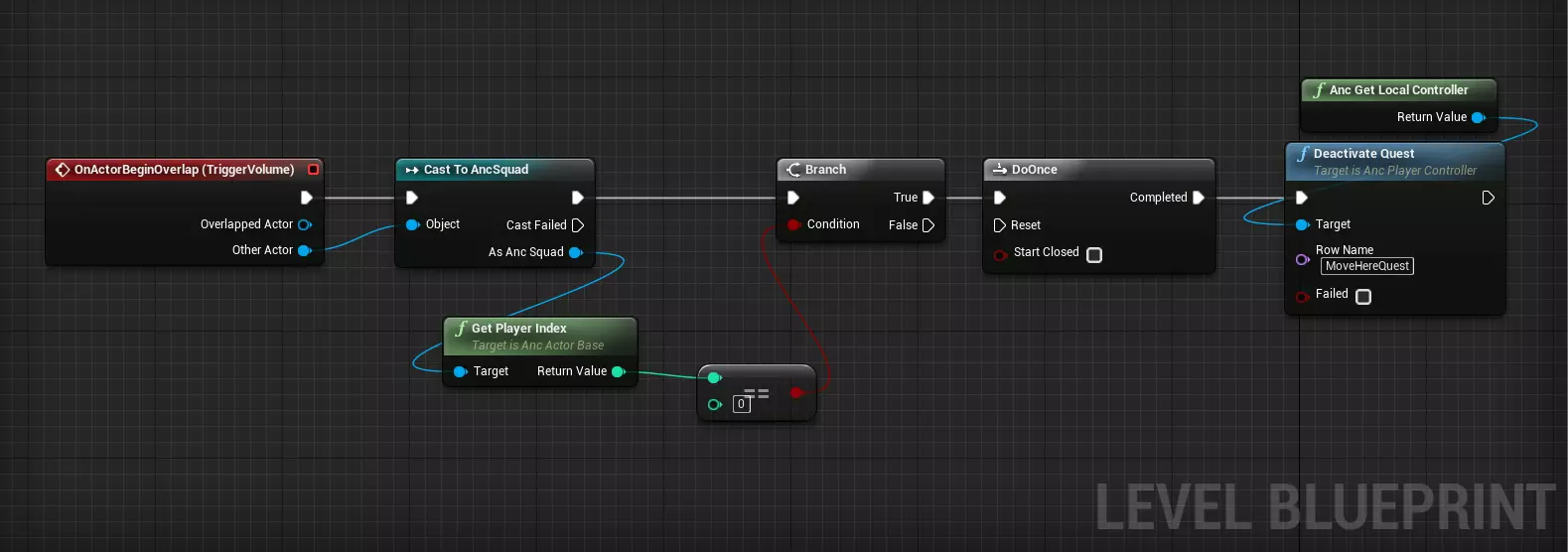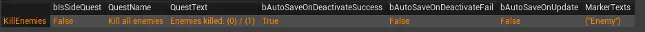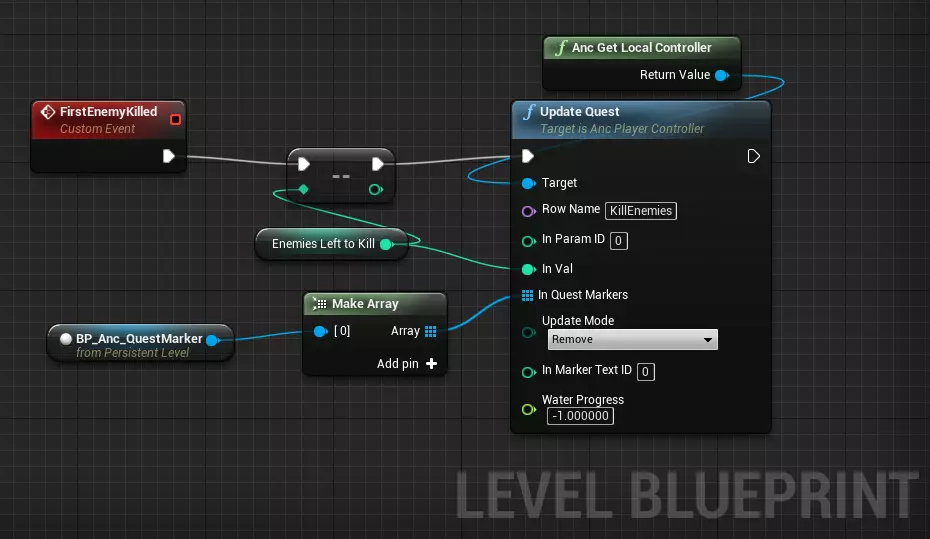 目标:使用Anc Get Local Controller。 行名称:你之前创建的任务数据表中的任务行名称(唯一ID)。 在任务标记中:包含关卡上任务标记引用的数组,你可以为该任务使用一个任务标记(如本示例)、多个任务标记,或不使用——若不使用,可使用0元素数组(移除Make Array节点上的引脚)。 在参数X中:任务参数的初始值。任务参数的用法将在下文说明。 水位进度:0到1之间的值会使带有水位进度的进度条随任务文本一同显示(该机制用于部分撒拉森人关卡)。 此时,当你开始游戏,经过初始延迟后,你创建的任务应会变为激活状态。 若要停用任务,请使用Deactivate Quest节点。在本示例中,我们是在检测到玩家小队进入触发体积后执行此操作(为此,请在体积上使用“仅重叠小队”碰撞预设)。玩家的小队将具有与玩家出生点的“期望玩家索引”相同的玩家索引(“是否由AI控制”设为 false),该索引通常为0。