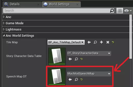 行名称:对话唯一ID,玩家不可见。 语音波形:对话的音频文件;不用担心,如果您只想使用纯文本对话,可以将该属性留空。 角色:将说出这句对话的角色;您可以在以下数据表中找到可能的说话者:Content/Blueprints/Datatables/DT_StoryCharacterData 遗憾的是,添加新角色并不简单,需要修改基础内容和游戏代码。 文本:对话文本。 FaceTextureCache 和 SpeechWaveCache:忽略这两项,它们会在需要时自动填充。 然后,您需要在【Anc世界设置】中将【语音映射数据表】属性设置为您的数据表。