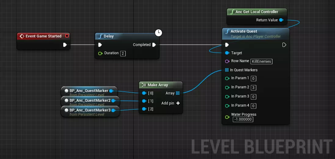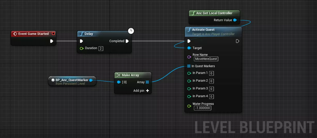 好了,现在任务数据设置完成,该进行脚本编写了! 打开关卡蓝图,这里是实现所有功能的地方。要激活任务,你需要在Anc Player Controller上使用激活任务节点。例如,你可以在关卡开始后几秒钟激活任务,为此可以使用游戏开始事件。重要提示:不要在关卡蓝图中使用开始播放!在开始播放后我们仍在加载资源,所以对玩家来说真正的游戏开始是在游戏开始事件触发时。