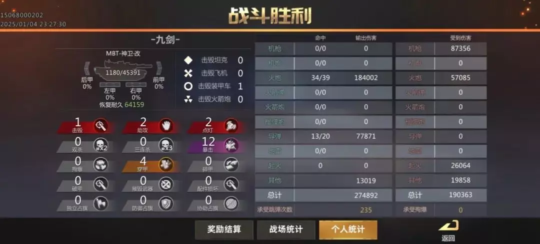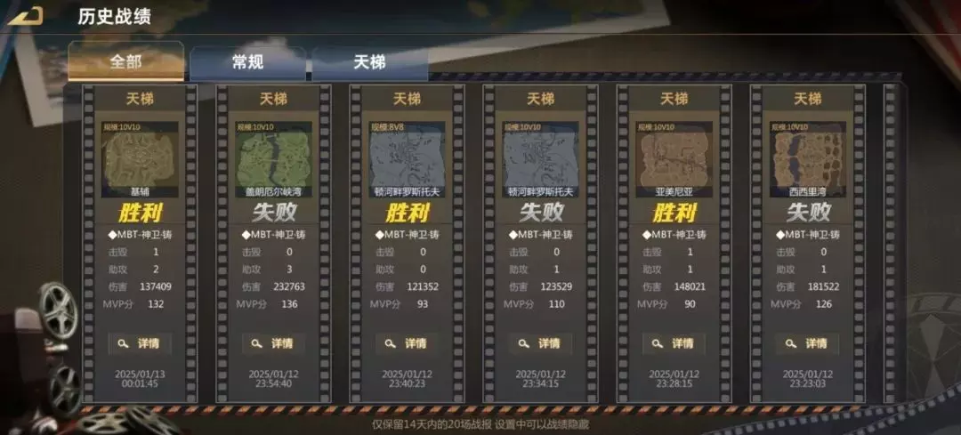 这么一看,那两个减装填的数值有什么问题吗?当然没问题啊,这怎么能叫抽象呢,这叫有失才有得。当然了,各位也不必担心官方要卷钱跑路了,因为MBT-神卫这辆车本身的上限高但下限低,即便给到了如此的属性和数值,还是难以和高端载具一较高下的。 二、实战体验 既然提到了载具强度,那自然要经过实战检验。图示战绩仅供参考,不代表载具的强度下限。