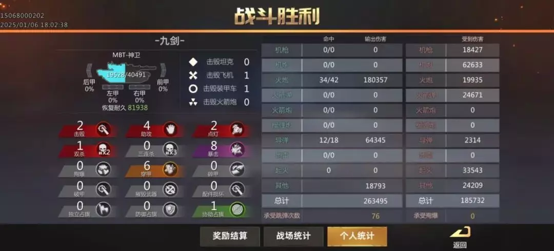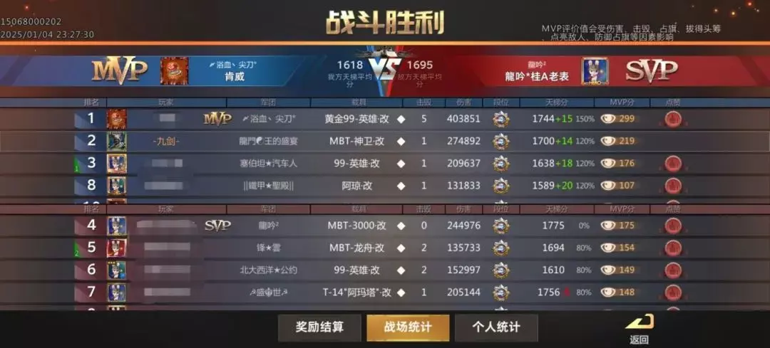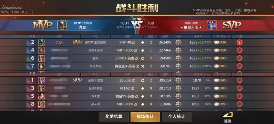上图所示的第二场战斗是逆风翻盘,基本上代表了MBT-神卫的强度上限。这时候就有人要说了,主播主播,你的神卫确实很强,但还是太吃操作了,有没有什么简单又强势的载具推荐一下?有的,兄弟,有的,这么强的载具当然是不止一个了,一共有九个,都是当前版本T0.5的强势载具。掌握一到两个,上个英雄2400分都是没有问题的;如果能掌握一半以上的话,打个排行榜前十那也相当的轻松,要像主播一样九个载具的熟练度都拉满的话,可以直接去登上星路联赛的首发阵容了。