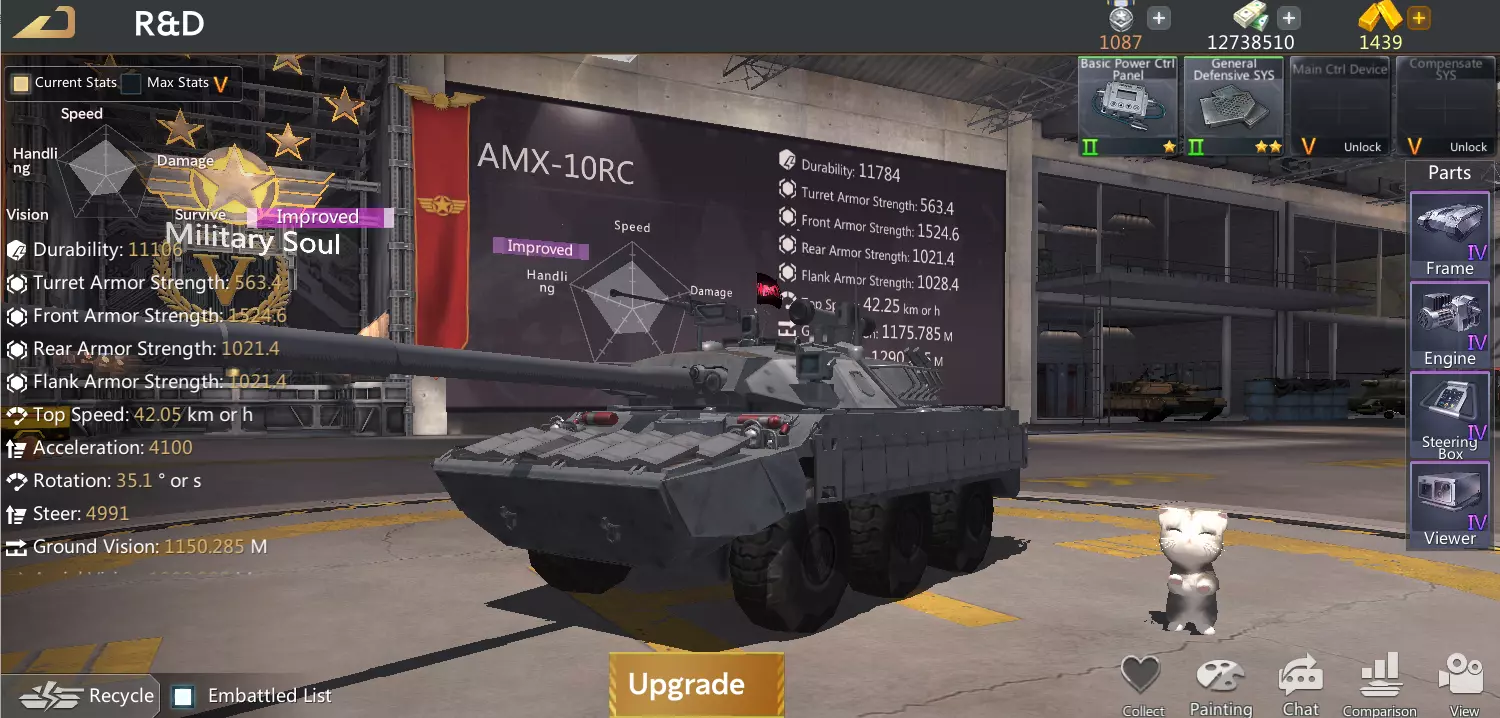 从面板数据中可以发现,神卫与原型的属性略有参差却势均力敌,在承伤、机动、侦测和输出四个方面,有增强的就有削弱,有一种吃一堑长一智的幽默感。整体来说呢,增强和削弱的点都无伤大雅,甚至更贴合双发弹夹炮和双导弹轻坦的载具定位。