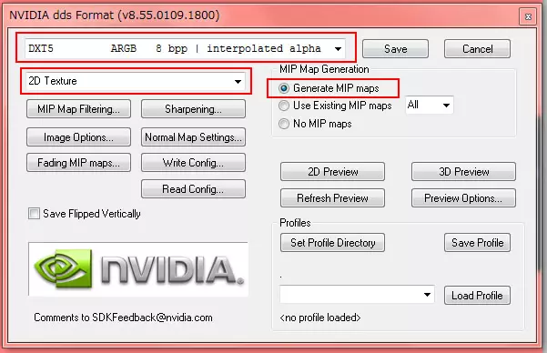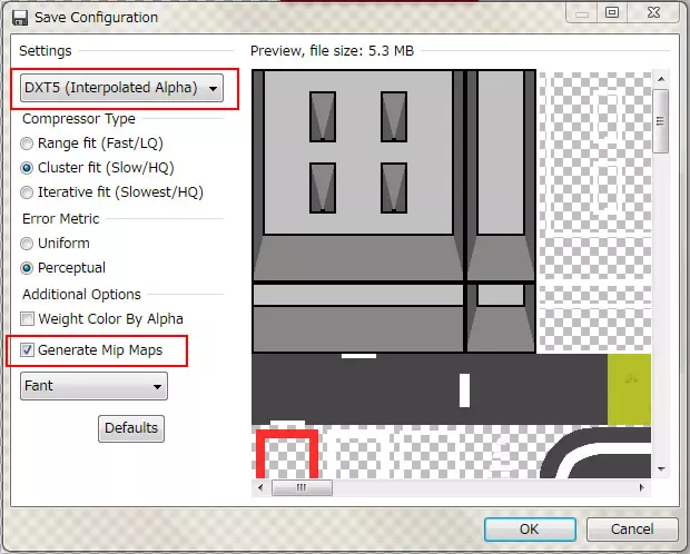 保存选项 *DXT5(插值阿尔法) *生成Mip贴图检查