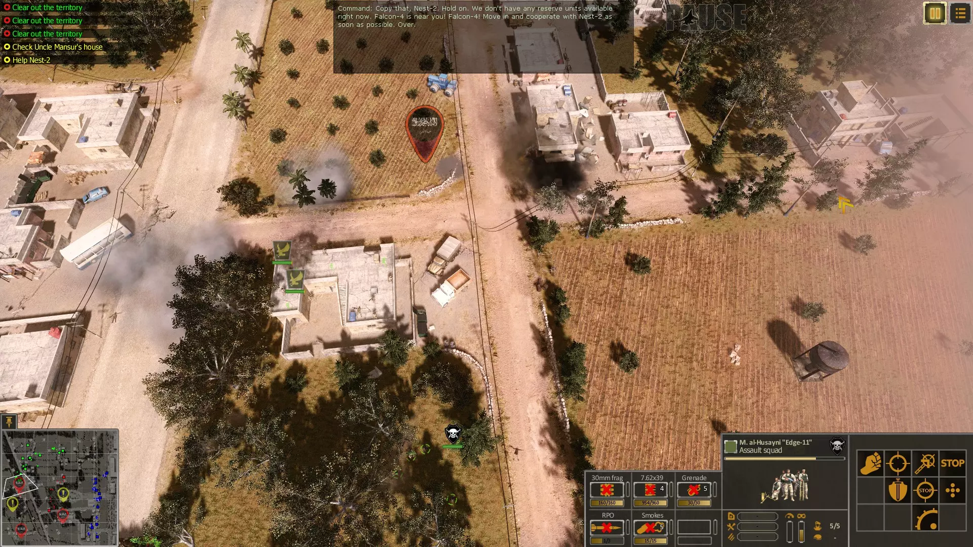 ### 清剿建筑物指南 本指南将教你如何以更少的伤亡清剿建筑物。清剿建筑物往往会造成大量伤亡。人工智能在基础游戏任务和DLC任务中频繁使用手榴弹、火箭筒、反坦克导弹等武器,这些武器对我方单位通常是致命的。 #### 突击小队 突击小队将在第3个任务中解锁,因为在基础游戏后续的以下任务中,你需要清剿大量建筑物: - 拉塔基亚与哈马边境 - 大马士革郊区 - 帕尔米拉 当无法用火炮/坦克清剿敌方建筑物时,或者当敌方在特定建筑物内部署了反坦克导弹小队,导致你无法在大片区域使用坦克时,你应当使用突击小队。现在你可能会想:“嗯,不过我可以用我所有可用的单位攻击这个区域……” 但有3个理由不这么做: -很难知道特定区域的敌人兵力。 -游戏中AI可能会在某些时候发动反击(有时是通过事件触发)。 -这很可能会导致无法弥补的伤亡。 使用你的突击小队的RPO火箭筒,它可以消灭建筑物内高达80%的敌人。运气好的话有时能达到100%。靠近敌方建筑物,占领敌方目标建筑附近的建筑物。查看该建筑是否在你的RPO火箭筒射程内。如果不在,使用一个步兵小队占领敌方建筑附近的建筑物,将敌人的注意力吸引到步兵小队身上。现在禁用突击小队除RPO发射器外的所有武器,这样携带RPO发射器的士兵就会靠近敌方建筑并开火。他有可能在到达前阵亡,但如果你对该区域进行烟雾遮蔽,这种情况就不太容易发生(这里的烟雾遮蔽指的是对附近可能会杀死你方RPO操作员的其他敌方单位进行烟雾遮蔽)。现在带领整个突击小队进入敌方建筑,清除里面剩余的敌人。 如果你操作得当,现在你已经以极少的伤亡占领了敌方建筑。 以下是一个例子: 任务地点是拉塔基亚和哈马的边境。 RPO攻击前: