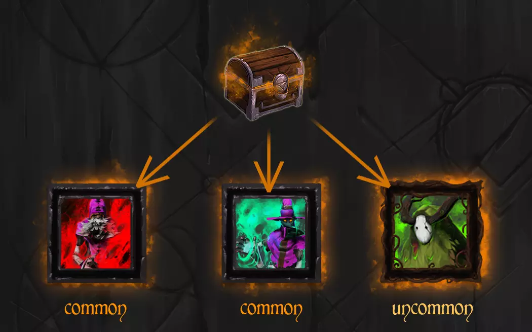 你可以将自己的角色更换为具有全新特性的其他角色。找到他们吧。 现在让我们来看看如何获取这些物品。 目前,《Spellsworn》中所有可用物品都位于上锁的宝箱内,需要使用相应的钥匙才能打开。 这些宝箱和钥匙会在玩家进行匹配对战(不包括自定义游戏)时,按特定时间间隔发放给玩家。平均每1小时游戏时间会掉落一个物品,但获得物品所需的实际时间可能更短或更长。请记得定期检查您的库存!目前游戏在赛后不会发送获得物品的通知,因此您可能会错过它们。