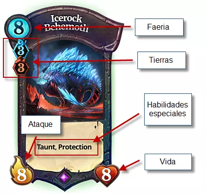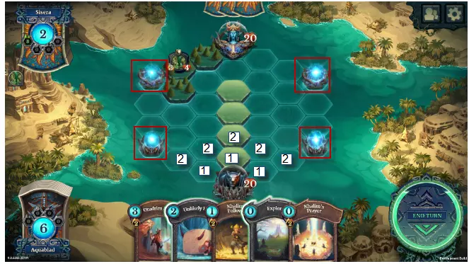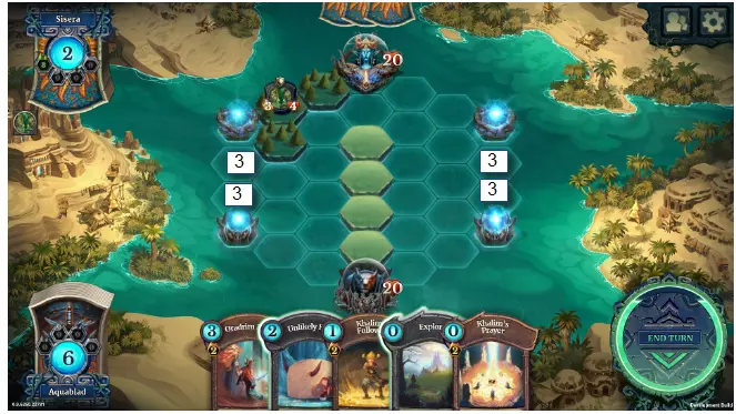 这里我们看到一张生物卡牌。左上角是召唤该生物所需的【源力】消耗。其正下方是土地要求。这张卡牌可以在湖泊或山脉格子上召唤,且需要至少3个湖泊和3个山脉才能将其放置到棋盘上。左下角是攻击力,右下角是生命值。 当一个生物攻击另一个生物时,两者会同时造成伤害,从生命值中减去对方的攻击力。如果生命值降至0或以下,该生物即被消灭。 此外,生物可能拥有特殊技能或特性。例如,这张生物拥有【挑衅】和【保护】技能。我们将在后续介绍这些技能。战斗棋盘 《Faeria》的战斗棋盘是放置生物和进行战斗的地方。 棋盘上方是对手的法球,下方是你的法球。 初始时双方玩家都拥有20点生命值。生命值永远不能超过20,若一名玩家的生命值降至0,则输掉比赛。因此,你在游戏中的目标就是摧毁敌方法球并保护自己的法球。 初始时整个棋盘都是水域。 每个回合,玩家可以放置2块普通土地(无色的草原),或者1块特殊土地(湖泊、山脉或沙漠)。这样,棋盘上的格子就会逐渐被不同颜色的土地填满。只有具备飞行能力或水生能力的生物可以在水域格子上或水域格子上方移动。其余生物的移动必须结束在陆地上。例如,拥有跳跃能力的生物可以越过一个水域格子,但最终必须落在陆地上。玩家可以通过在已有的土地上创建新的土地来改变自己土地的颜色,覆盖原有的土地。但无法触碰对手的土地(除非通过某些法术)。了解如何利用土地的放置来为自己带来优势非常重要。一方面,在防御上,你必须减缓或阻止敌人土地的推进,并防止对手在你的灵球附近创建土地。需要注意的是,玩家只能在自己的土地上召唤生物。进攻时则相反:要将你的土地尽可能建在靠近敌方核心的位置。