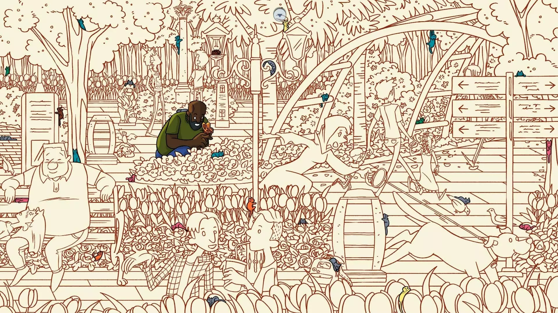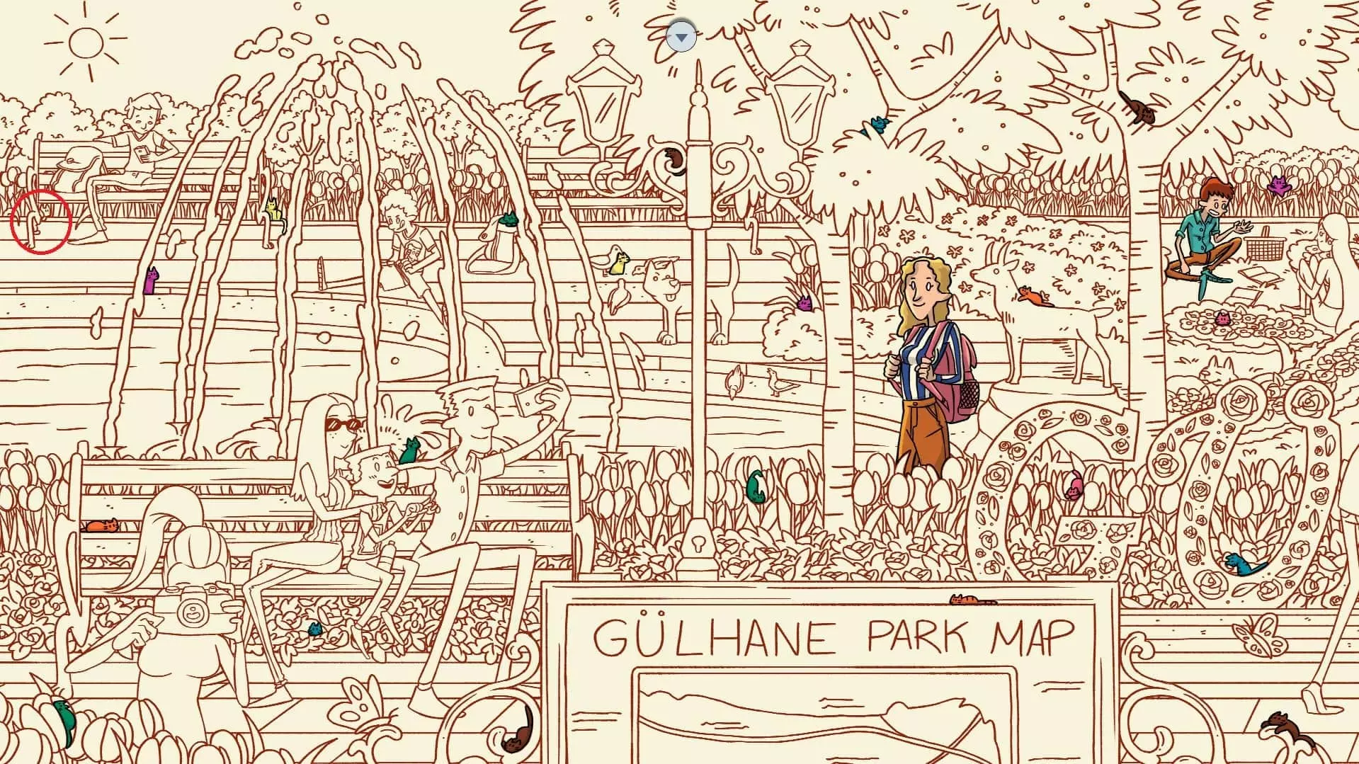 居尔哈尼公园 注:找到凯迪猫和苏丹猫后,居尔哈尼公园关卡将解锁。此关卡需要找到75只猫和5个人。最后一只猫已用圆圈标出。 左侧