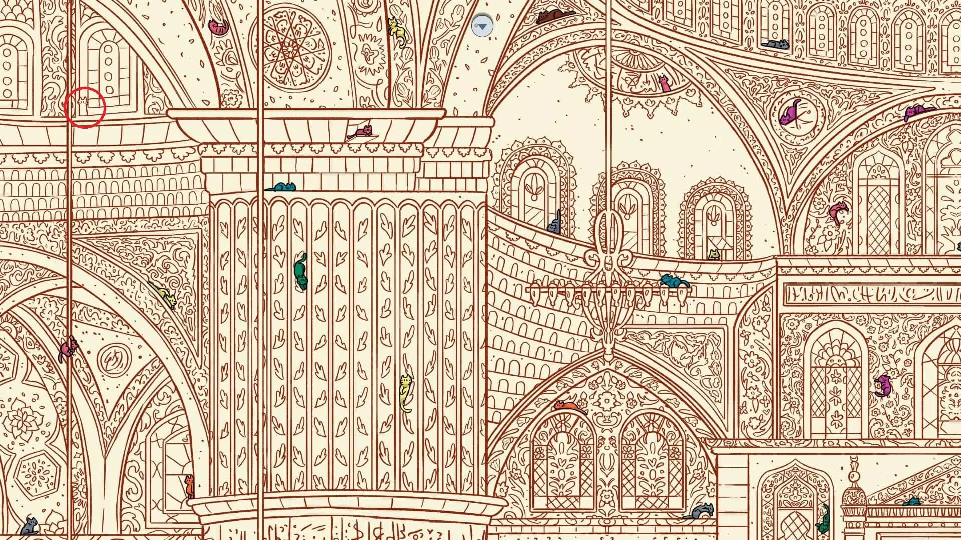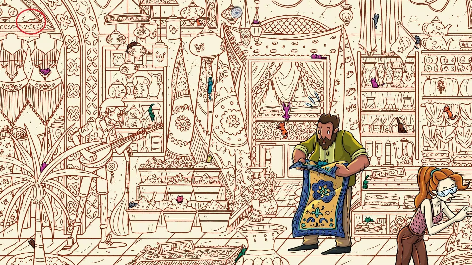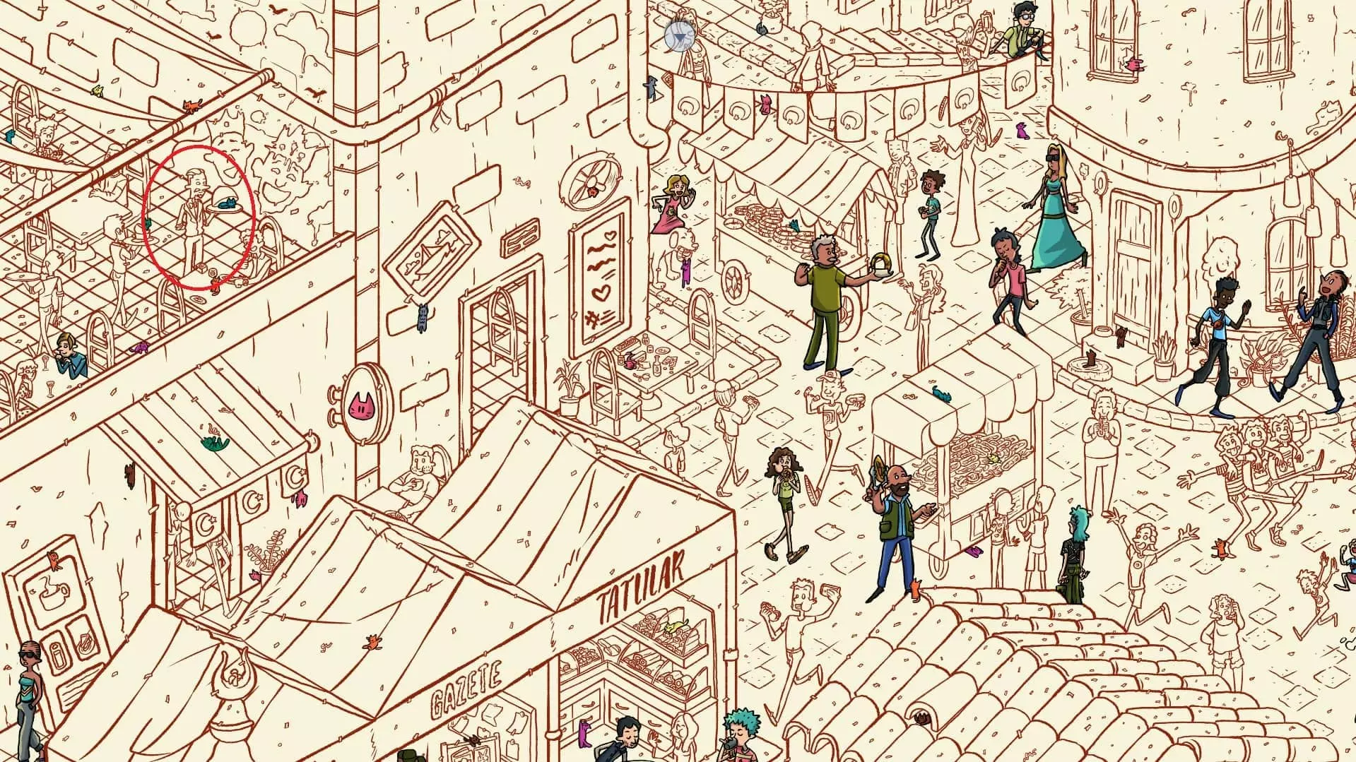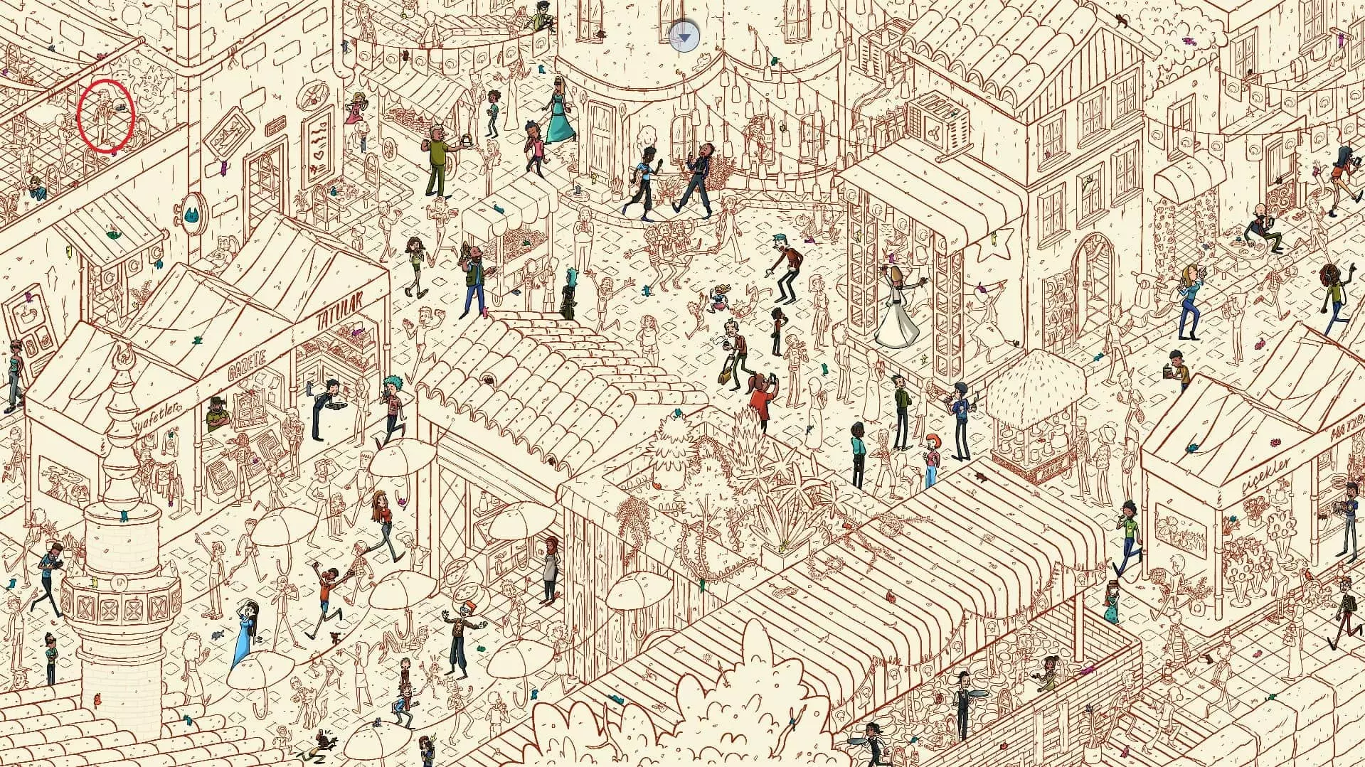大巴扎 注:找到【Koffy】和【Simit】两只猫咪后,大巴扎关卡将解锁。此关卡需要找到100只猫咪和10个人。最后一只猫咪已用圆圈标出。 左侧