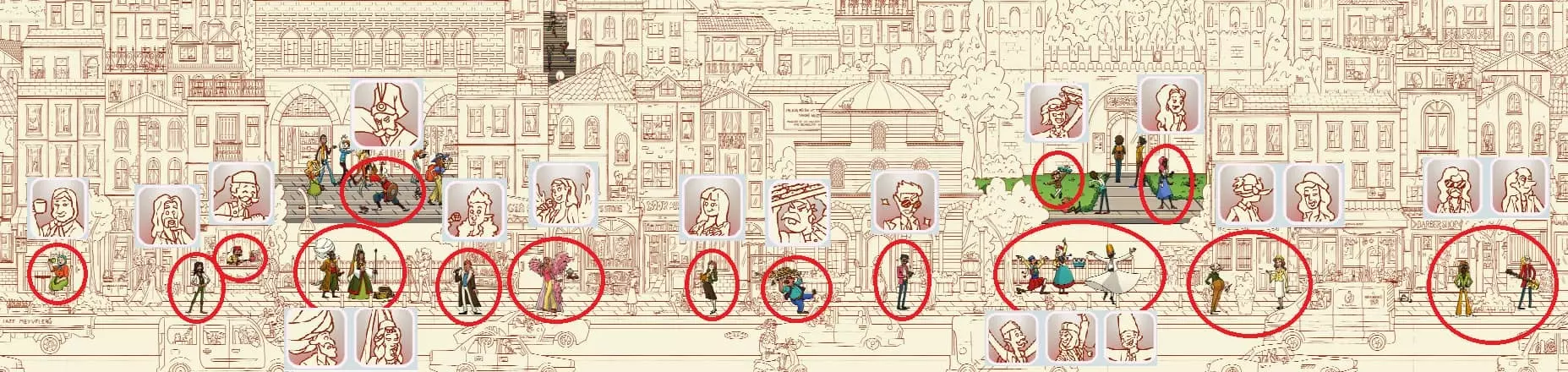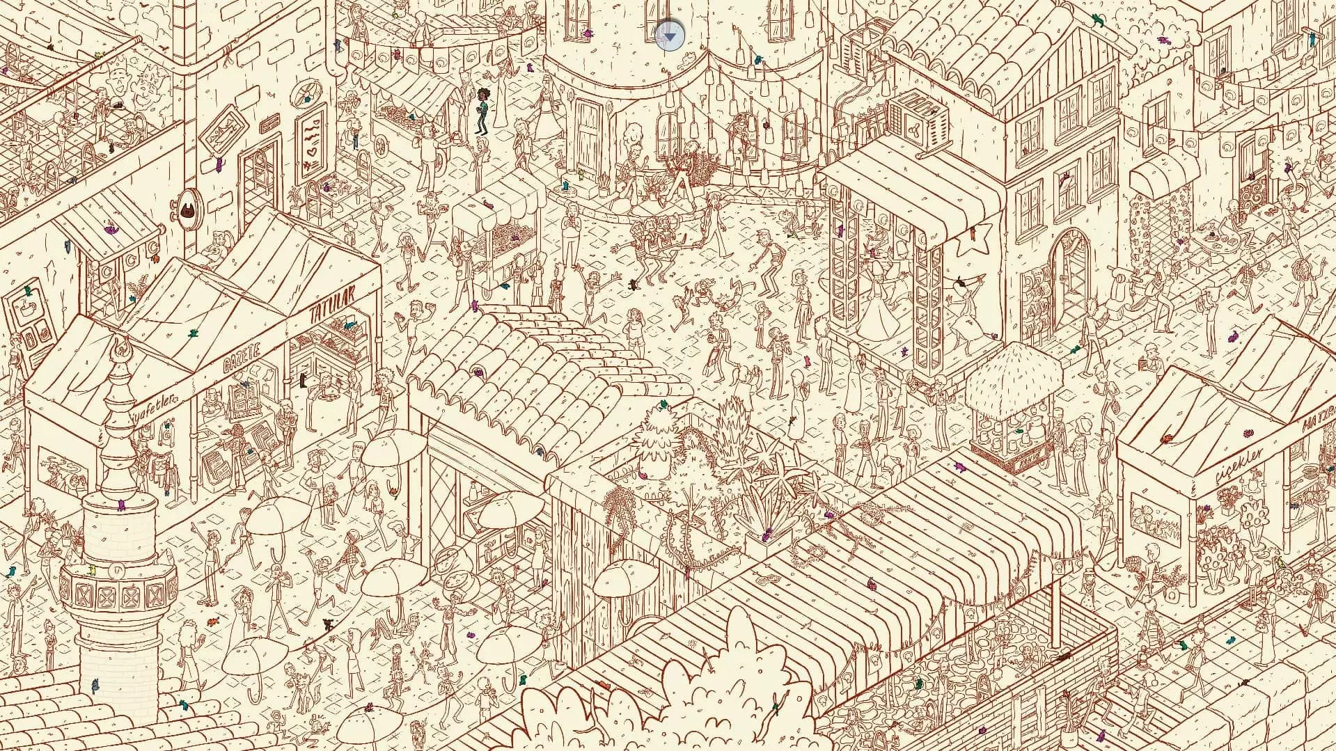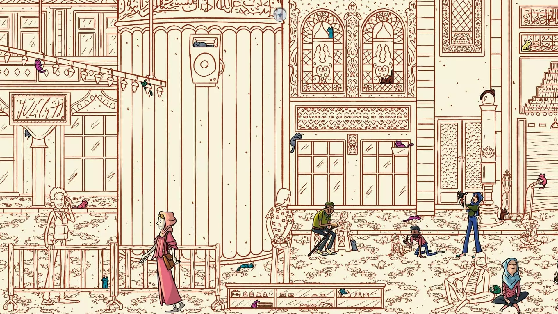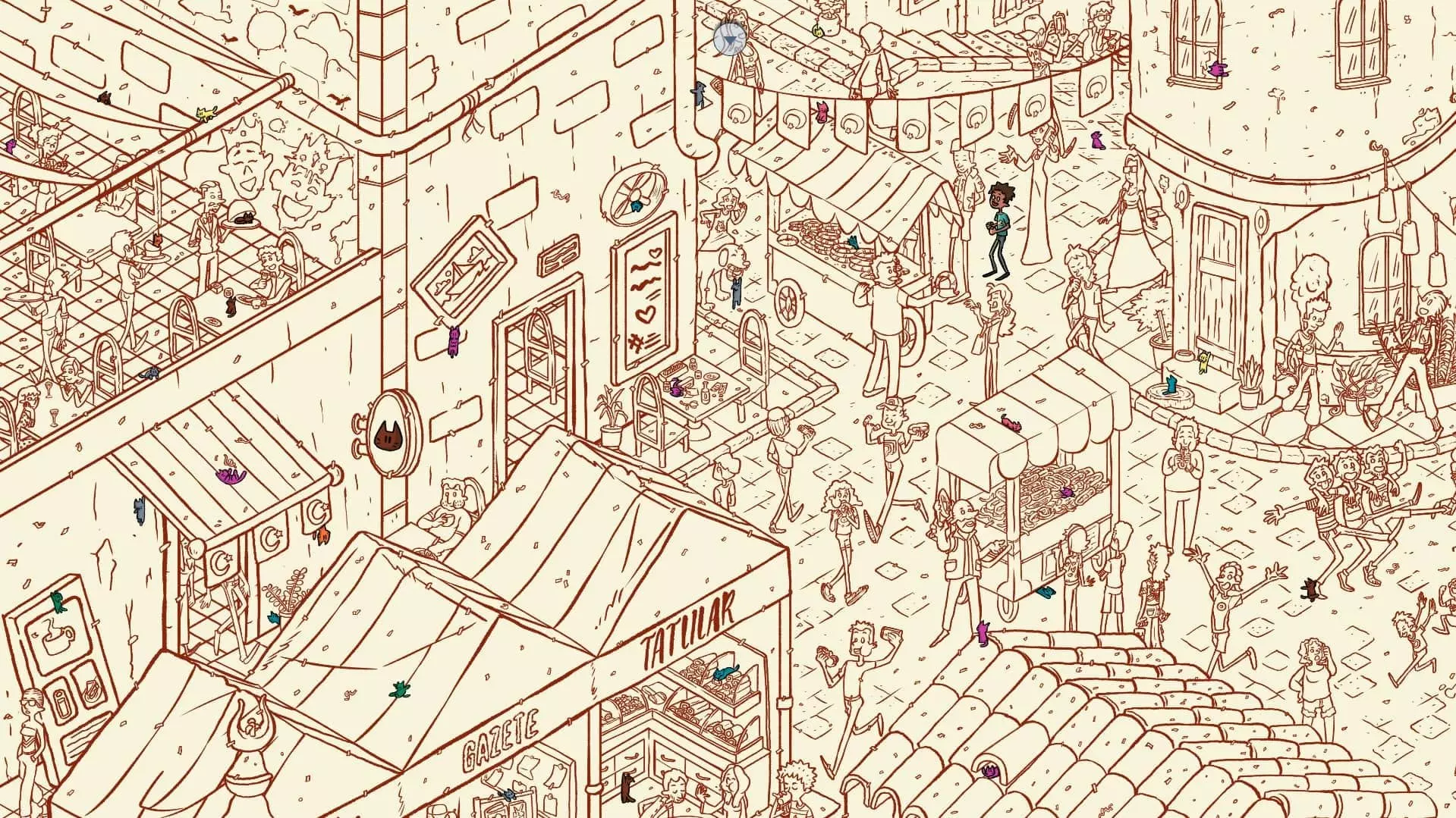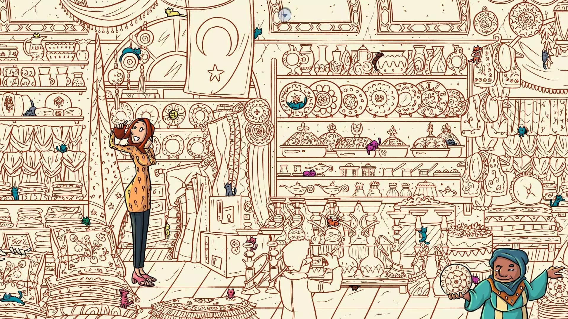 大巴扎 注:找到【Koffy】和【Simit】两只猫咪后,大巴扎关卡将解锁。此关卡需要找到100只猫咪和10个人。最后一只猫咪已用圆圈标出。 左侧