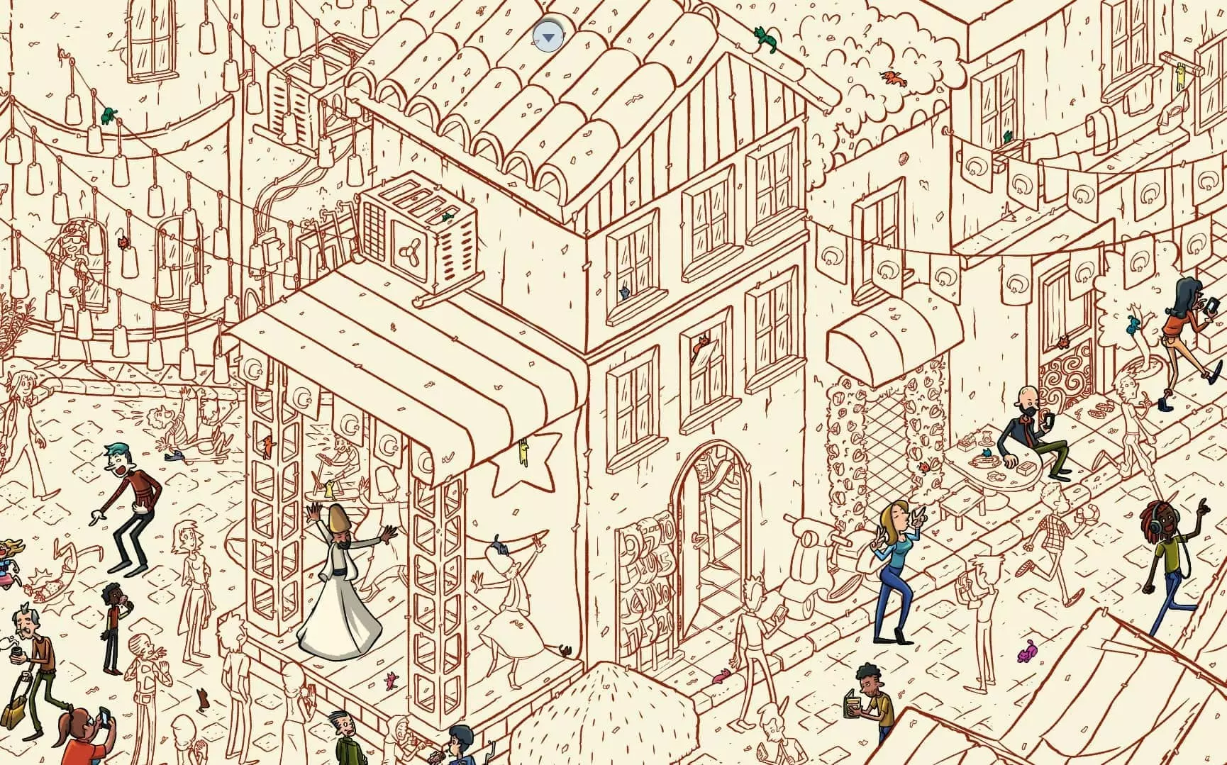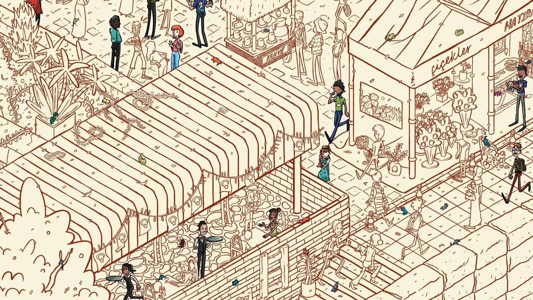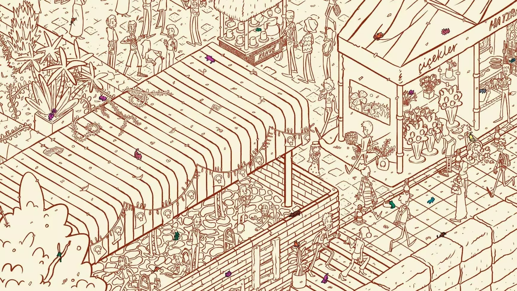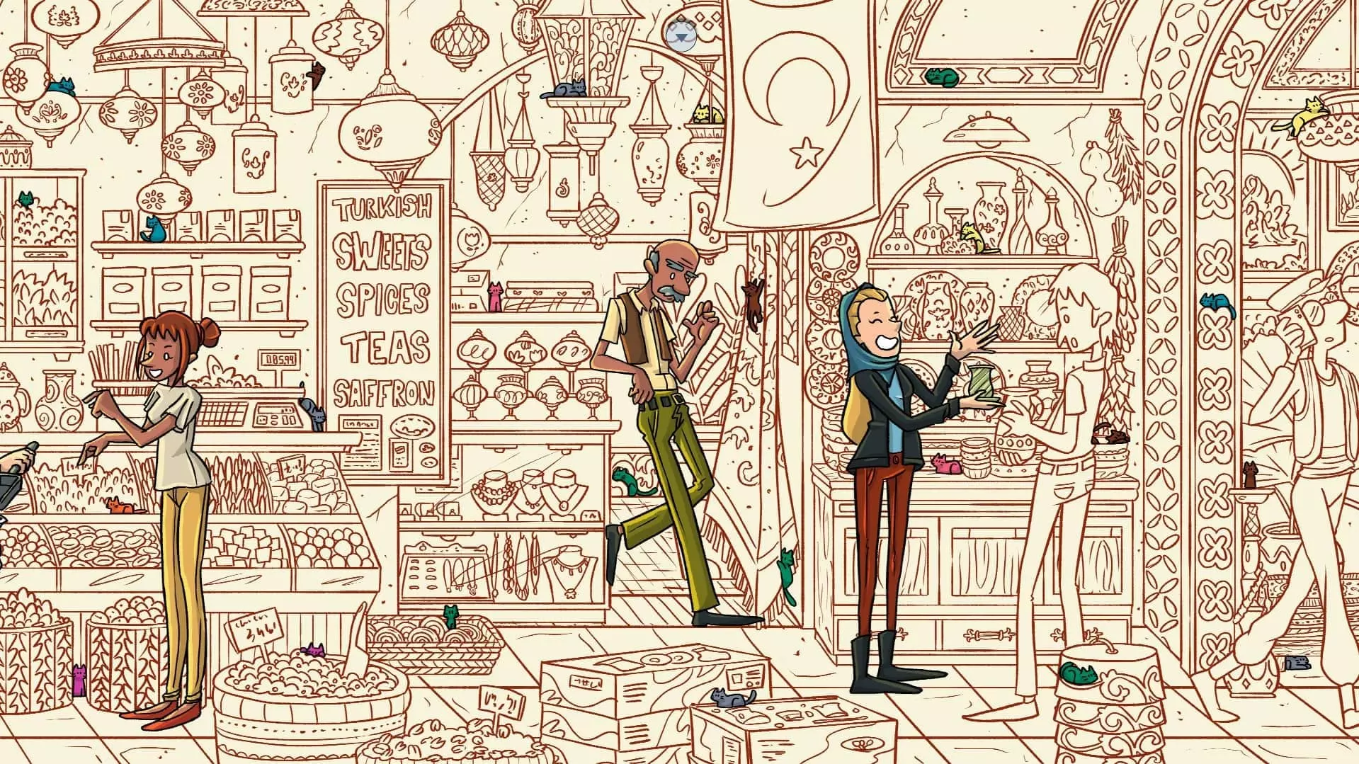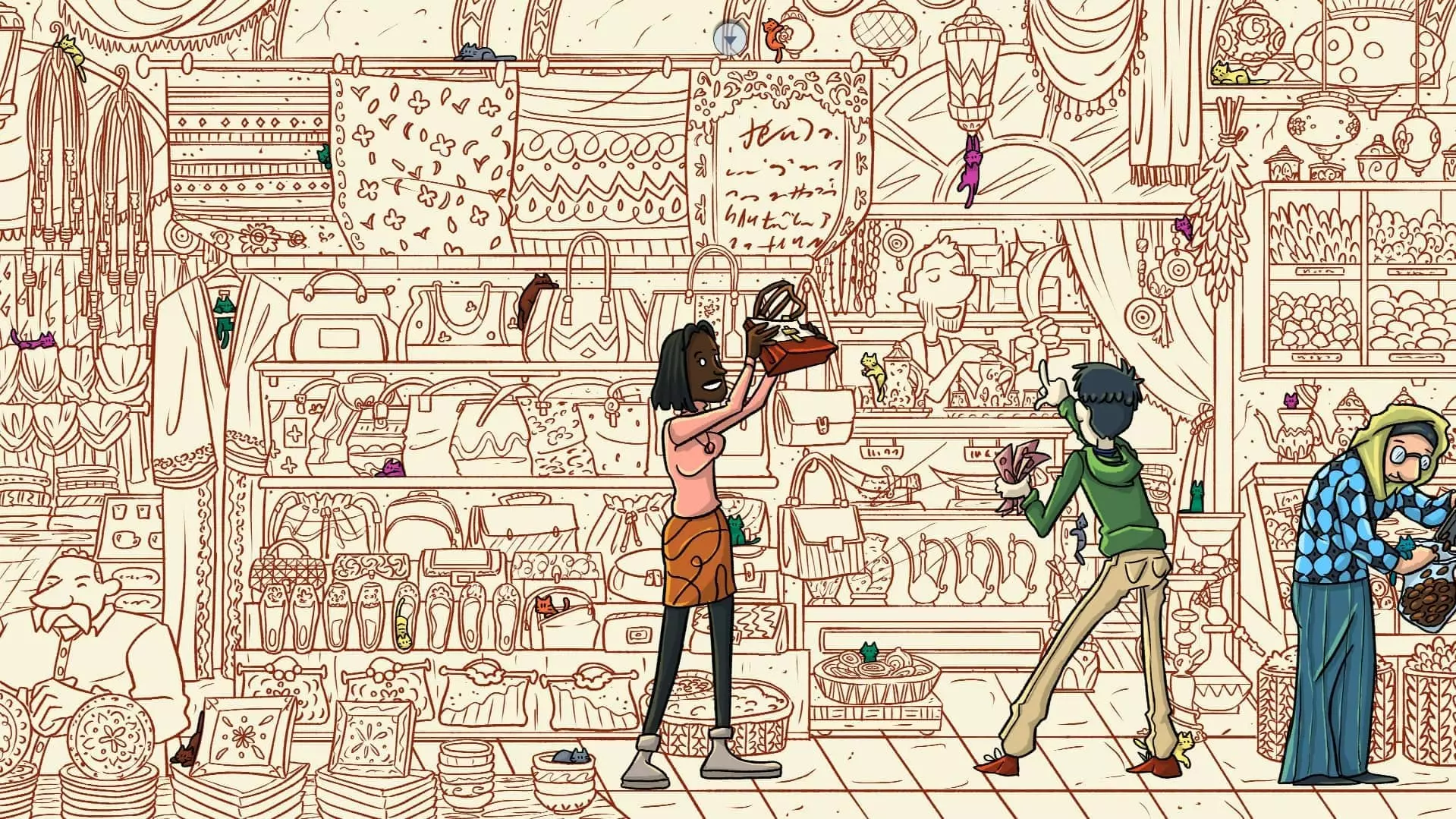 大巴扎 注:找到【Koffy】和【Simit】两只猫咪后,大巴扎关卡将解锁。此关卡需要找到100只猫咪和10个人。最后一只猫咪已用圆圈标出。 左侧