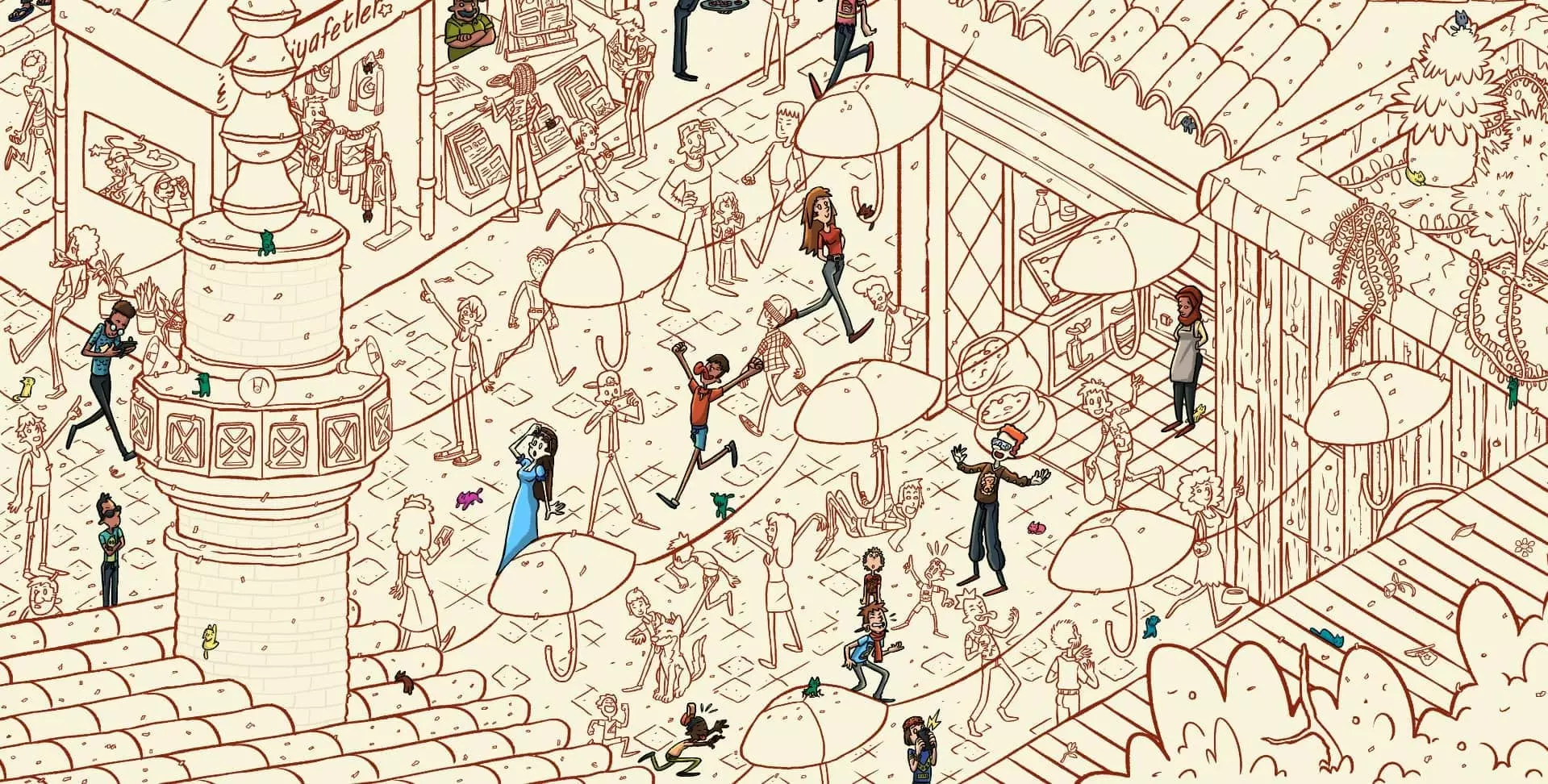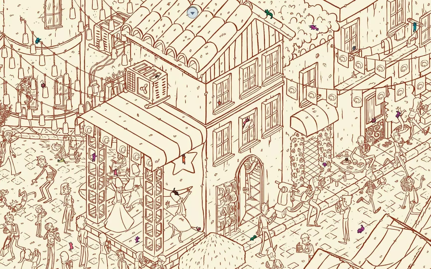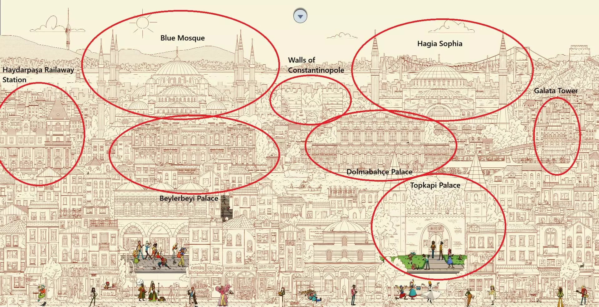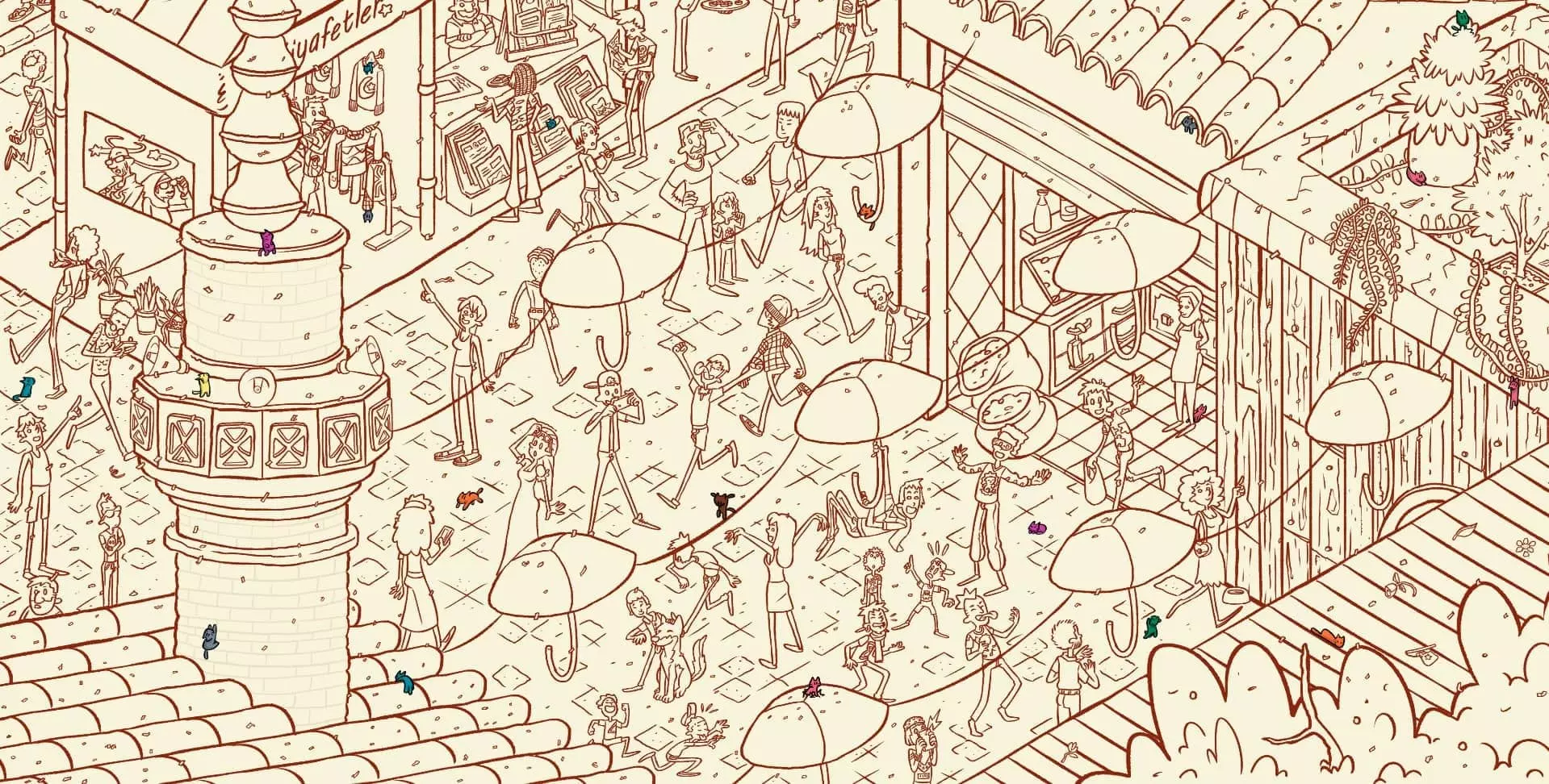 大巴扎 注:找到【Koffy】和【Simit】两只猫咪后,大巴扎关卡将解锁。此关卡需要找到100只猫咪和10个人。最后一只猫咪已用圆圈标出。 左侧