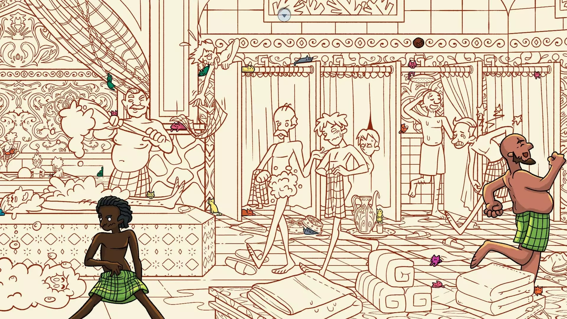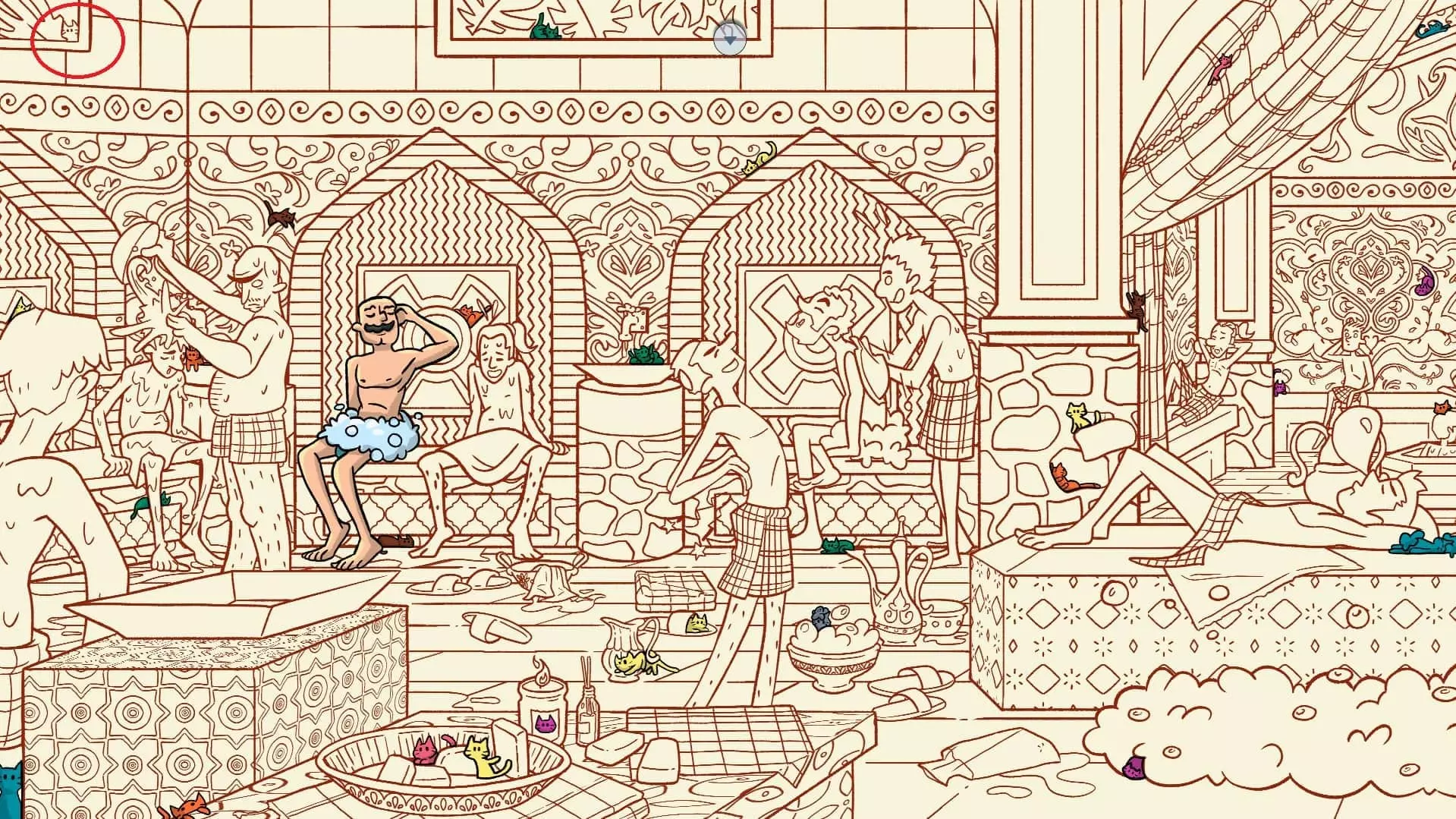 土耳其浴室 注意:找到安纳托利亚猫和古内什猫后,土耳其浴室关卡将解锁。此关卡需要找到50只猫和3个人。最后一只猫已用圆圈标出。 左侧