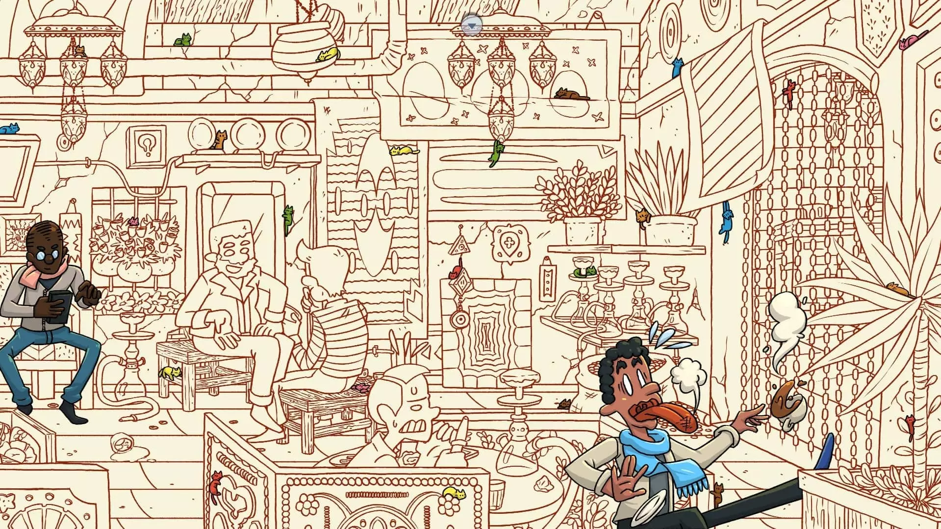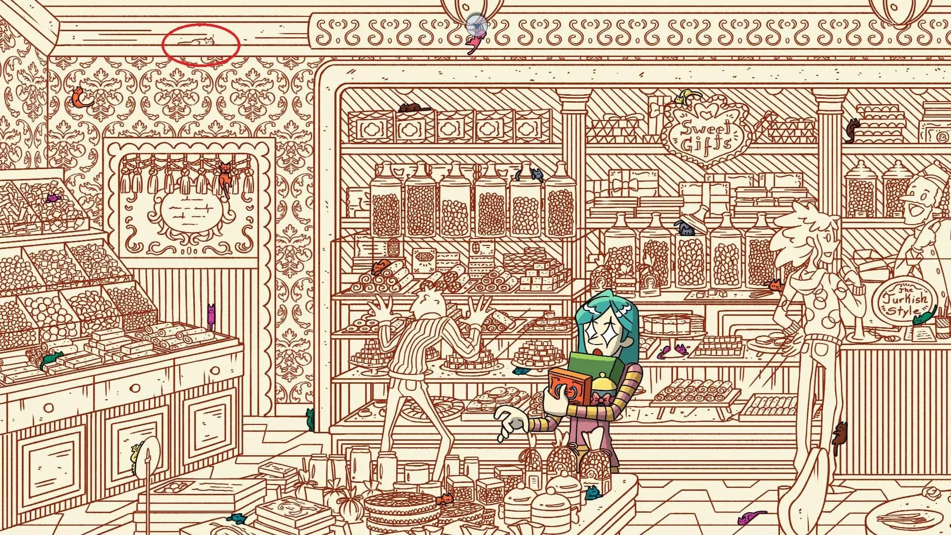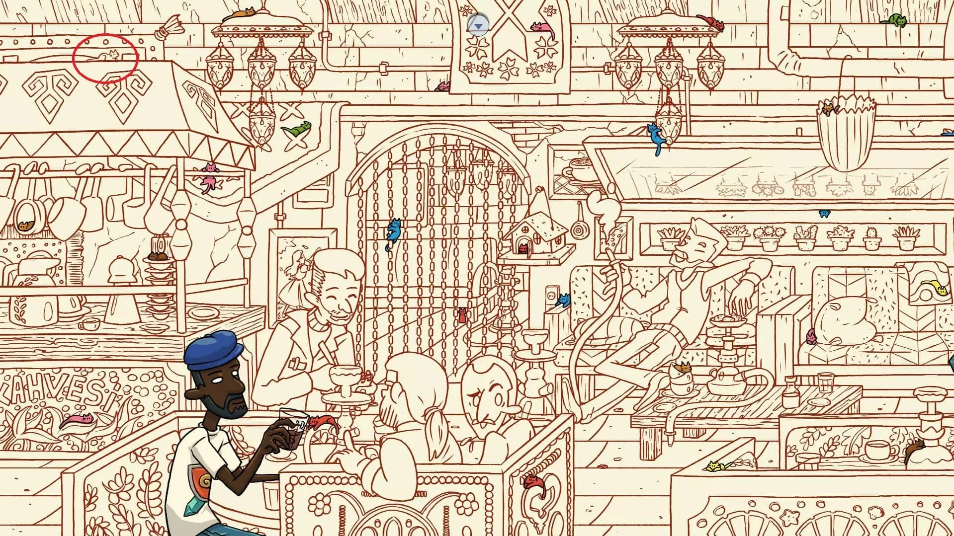水烟咖啡馆 注意:找到咖啡猫和街头猫后,水烟咖啡馆关卡将解锁。此关卡需要找到50只猫和3个人。最后一只猫已用圆圈标出。 左侧