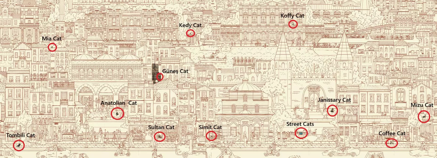 大家好, 本指南旨在帮助你找到所有隐藏的猫咪。有些猫咪很难被发现,所以如果你在寻找猫咪以完成游戏时遇到困难,欢迎使用本指南或查阅一下。保证能达成100%成就! 祝你玩得开心! 请注意! 以下指南将展示第一关(伊斯坦布尔)中特殊猫咪的位置。此外,每个关卡中都会显示城市居民。当你找到所有特殊猫咪并完成一整个关卡后,下一关将会解锁。游戏总共有8个关卡。