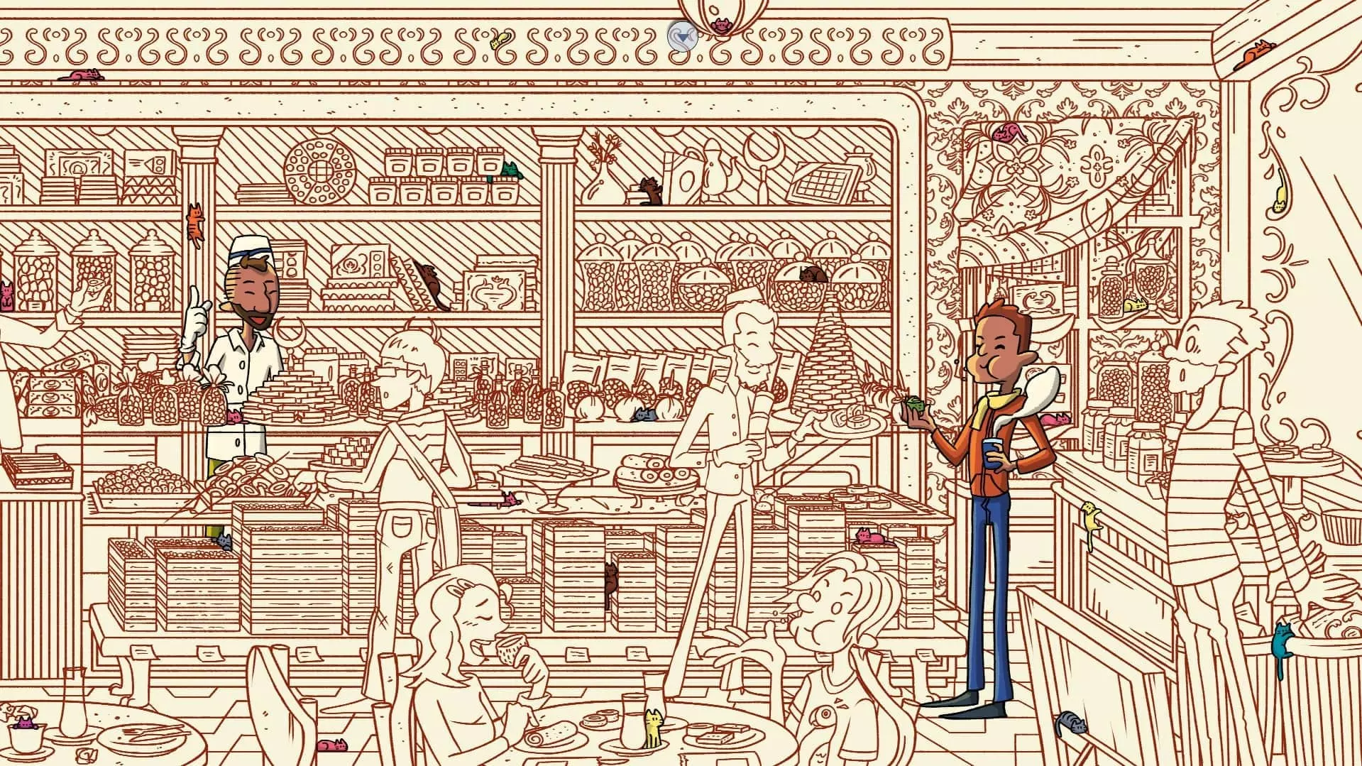 甜品商店 注意:找到米娅和 Tombili 猫后,甜品商店关卡将解锁。此关卡需要找到50只猫和3个人。最后一只猫已用圆圈标出。 左侧