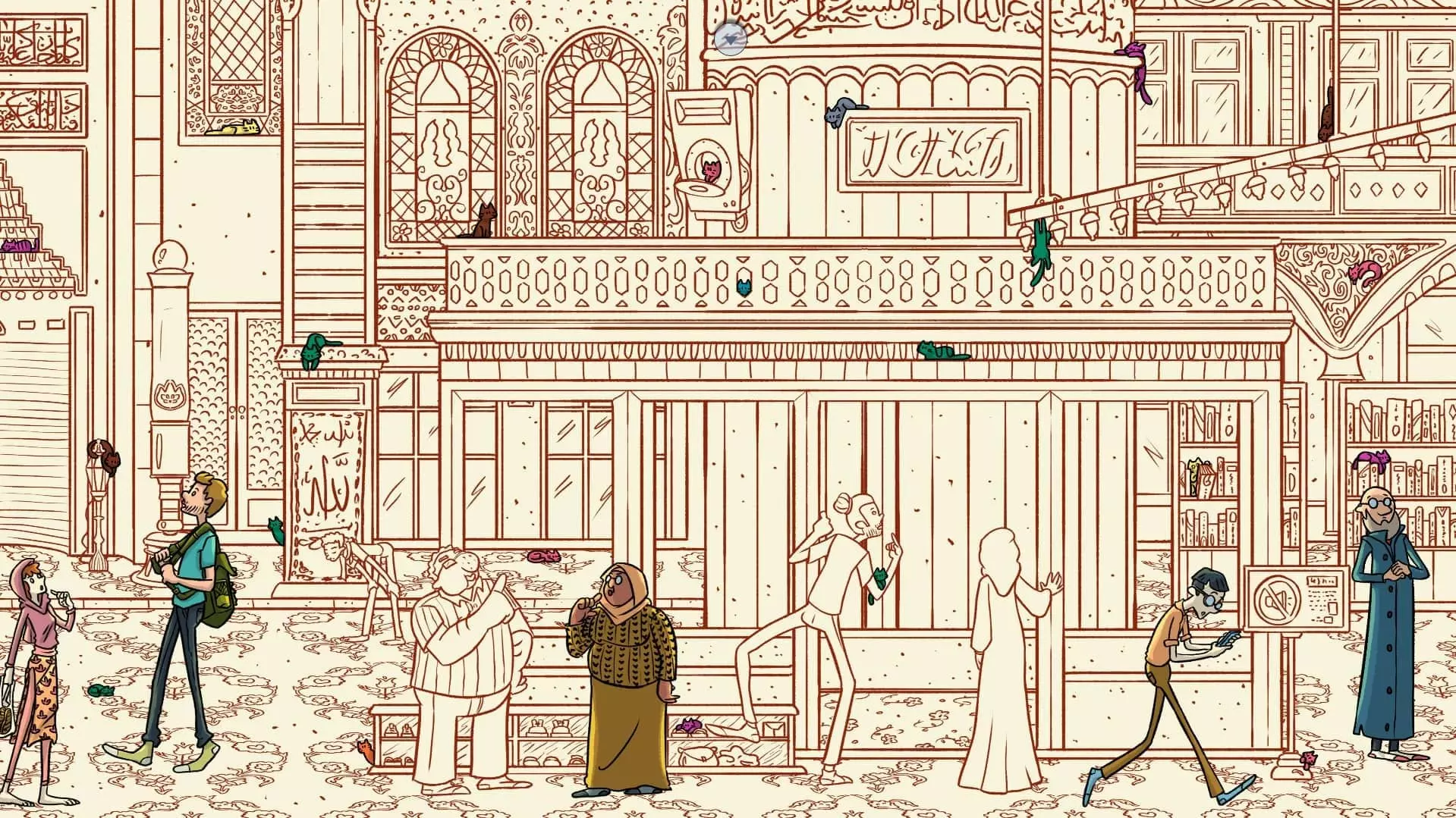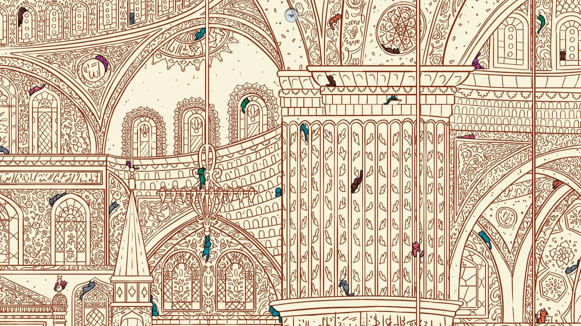 蓝色清真寺 注:找到禁卫猫和水猫后,蓝色清真寺关卡将解锁。此关卡需要找到100只猫和10个人。最后一只猫已用圆圈标出。 左侧